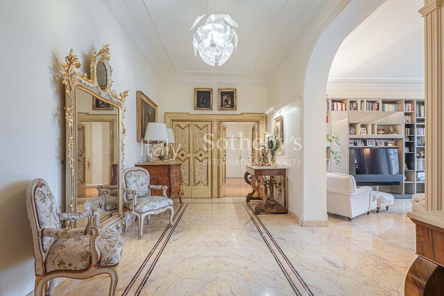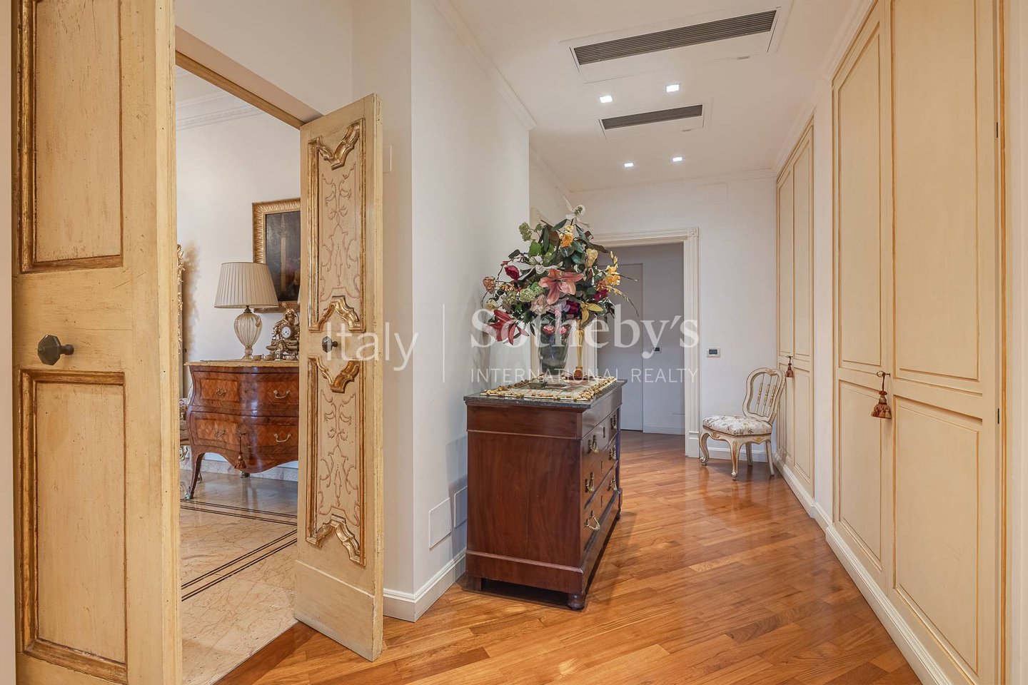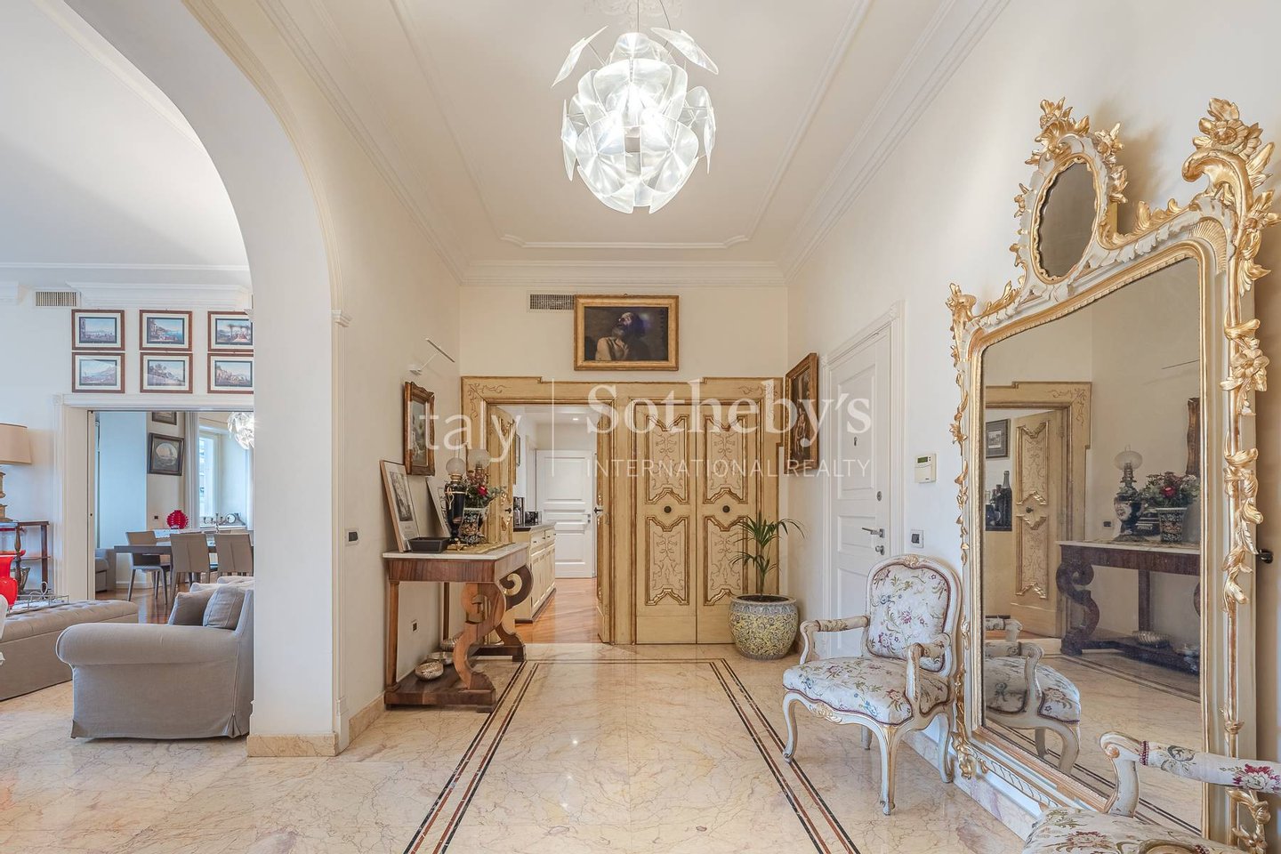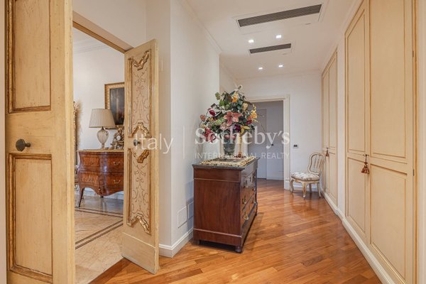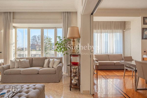 Die Innenraumaufteilung ist rational und harmonisch, geprägt von großzügigen Volumen und einem eleganten Gleichgewicht zwischen Privatsphäre und Empfangsmöglichkeiten. Abgerundet wird die Wohnung durch einen zugehörigen Kellerraum.