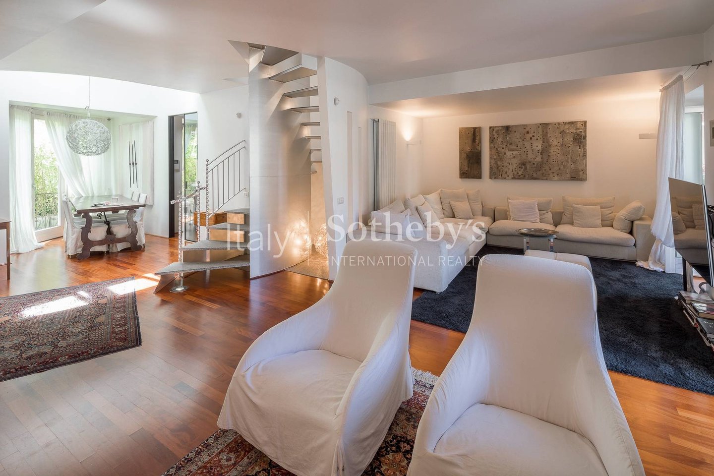 Die gesamte Wohnung besticht durch hochwertige Ausstattung, darunter Holzböden, Bisazza-Badezimmerfliesen, Klimaanlage in den Schlafzimmern, sensorgesteuerte Markisen für die beiden Dunstabzugshauben, eine elektrische Markise für die Terrasse und eine Alarmanlage. Zwei private Garagen und ein Keller runden das Anwesen ab.