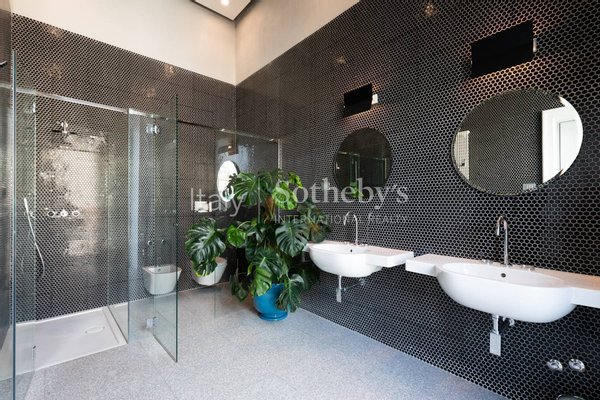 Die Innenräume umfassen ein einladendes Lese-Wohnzimmer, ausgestattet mit Samtsofas in sanften Farbtönen und Venini-Vasen, einen großzügigen ...mehr lesen