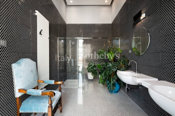 Die Innenräume umfassen ein einladendes Lese-Wohnzimmer, ausgestattet mit Samtsofas in sanften Farbtönen und Venini-Vasen, einen großzügigen Essbereich in Terrakottafarben mit Kristalltisch, antiken Holzvertäfelungen und spiegelverzierten Wänden sowie eine vollständig ausgestattete Küche mit professionellen Edelstahlgeräten.
