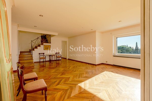In den Penthouse- und Super-Penthouse-Etagen eines prestigeträchtigen Gebäudes mit Concierge-Service gelegen, bietet dieses elegante Apartment eine exklusive Wohnlösung im Herzen des renommierten Viertels Monti Parioli.