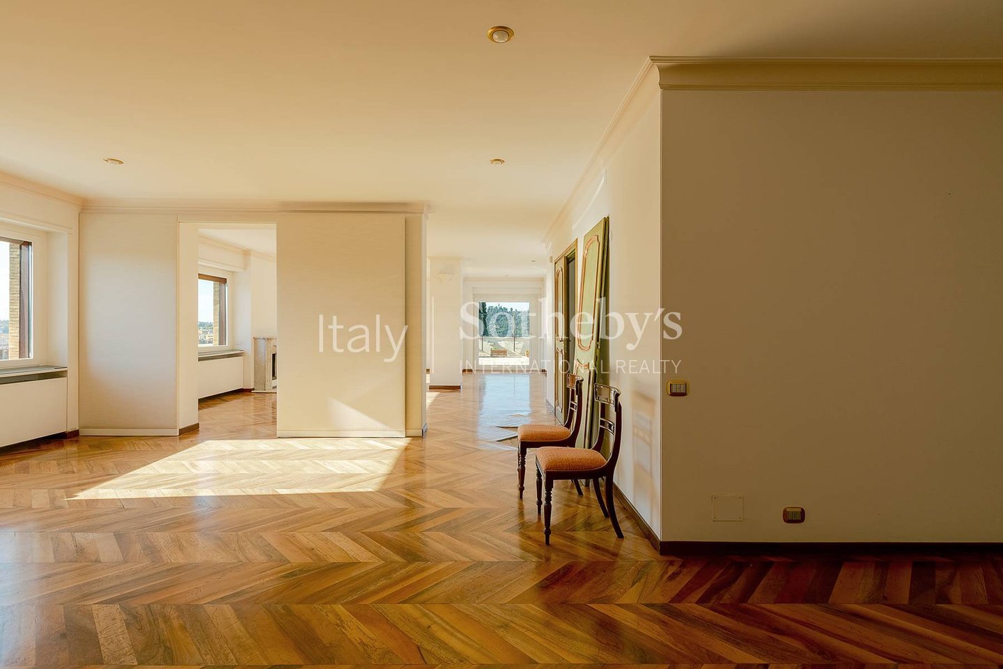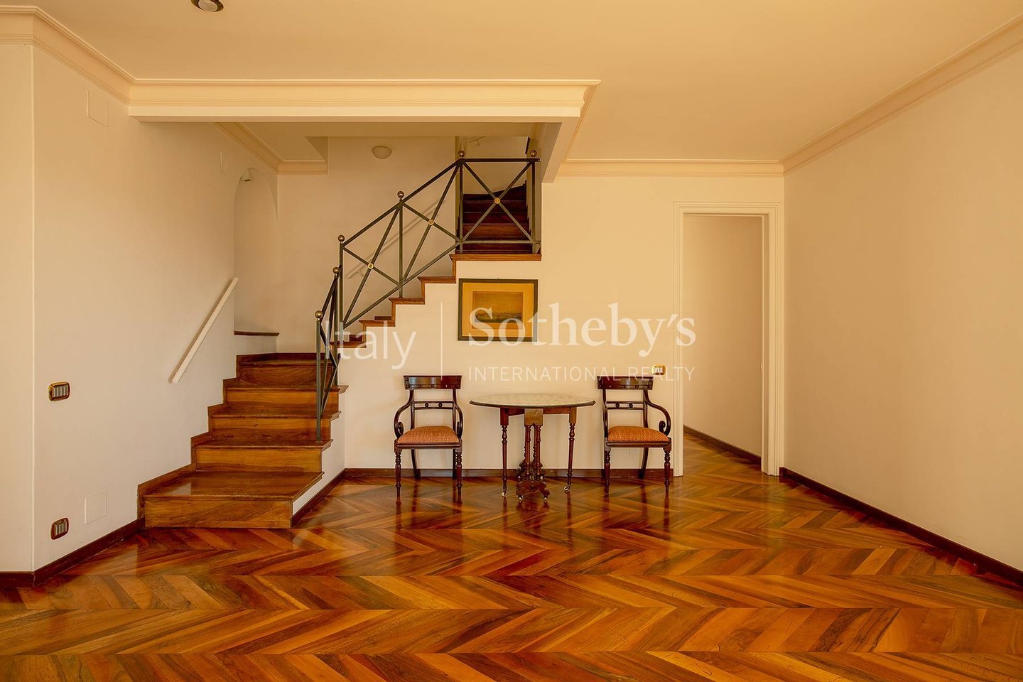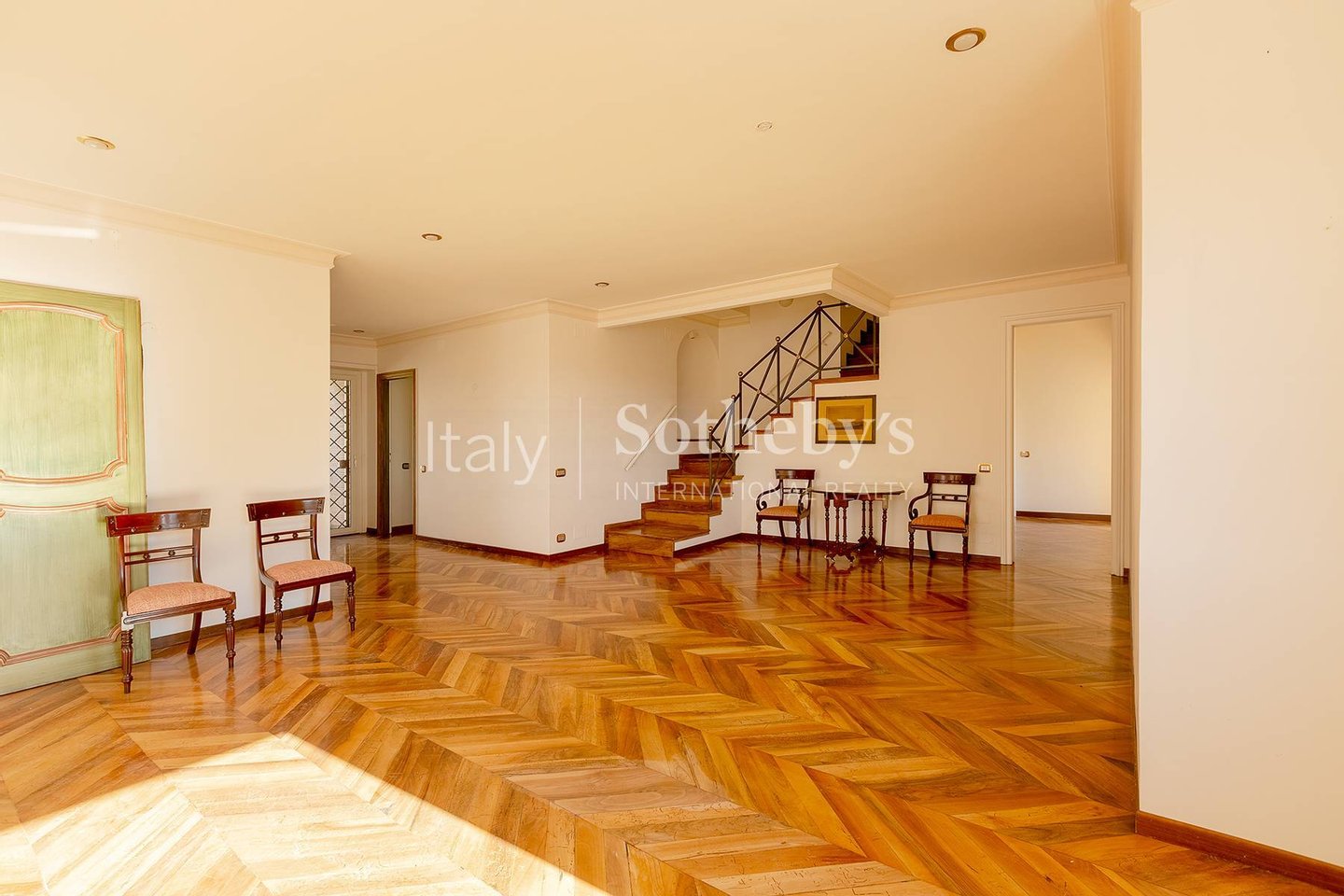 In den Penthouse- und Super-Penthouse-Etagen eines prestigeträchtigen Gebäudes mit Concierge-Service gelegen, bietet dieses elegante Apartment eine exklusive Wohnlösung im Herzen des renommierten Viertels Monti Parioli.