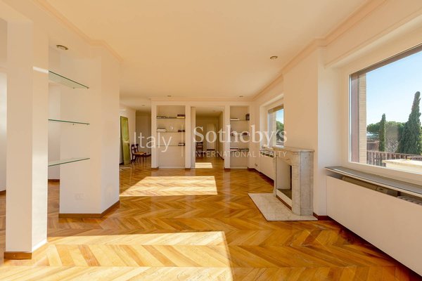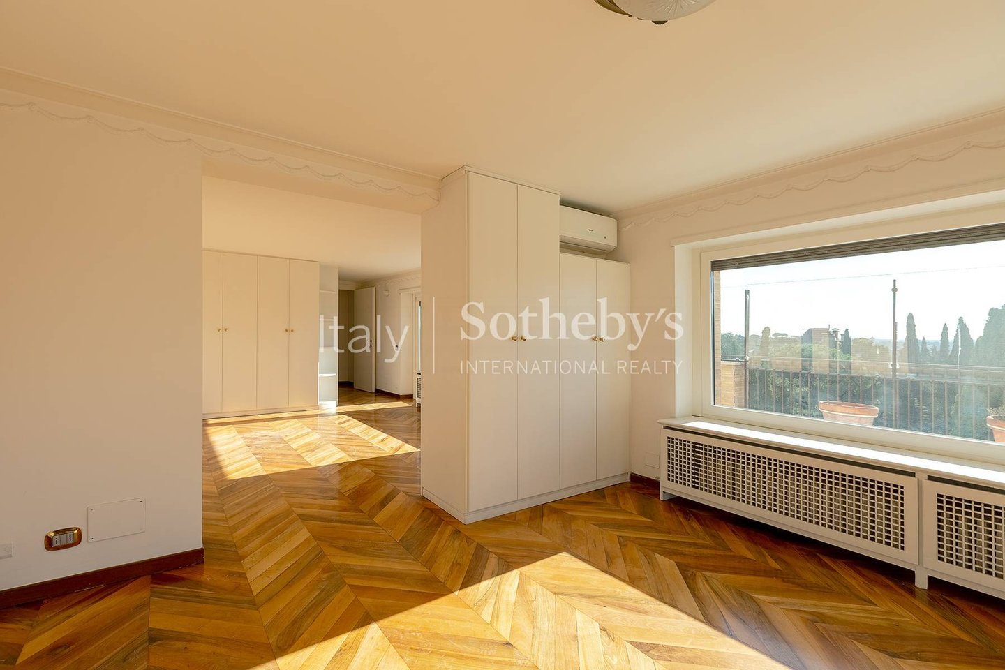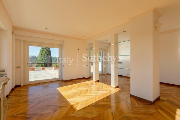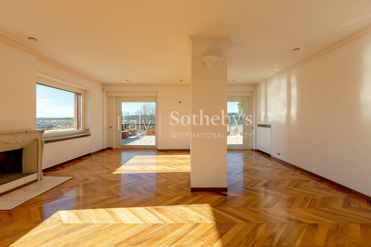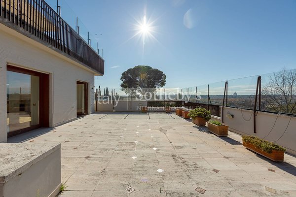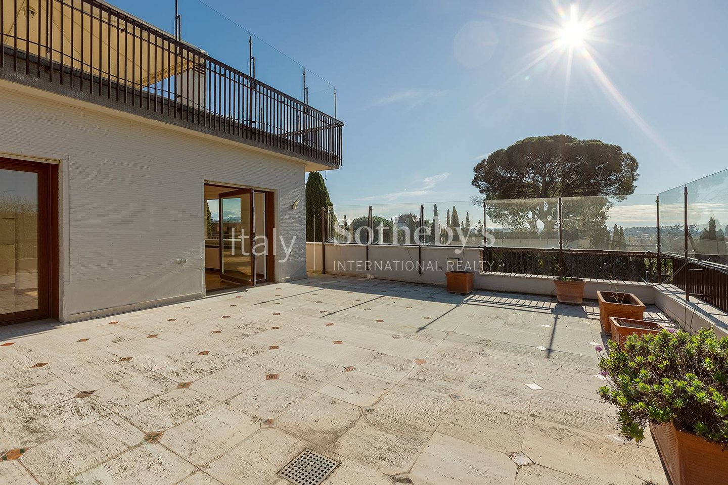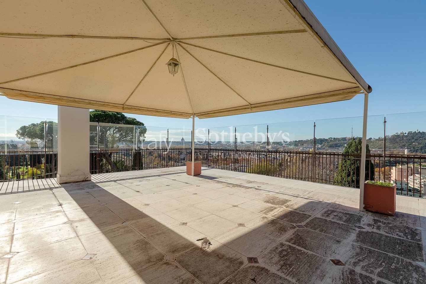 Die Immobilie wird durch herrliche Panoramaterrassen und einen umlaufenden Balkon bereichert, die großzügige Außenflächen mit einzigartigem Blick über Rom bieten. Ein Stellplatz in der gemeinschaftlichen Garage sorgt zusätzlich für Komfort.