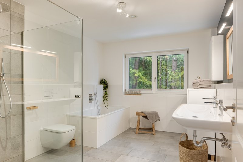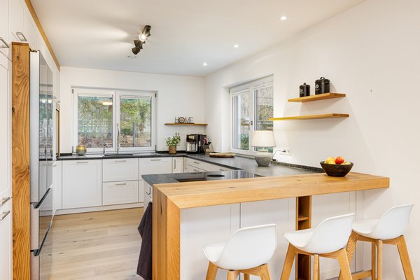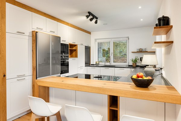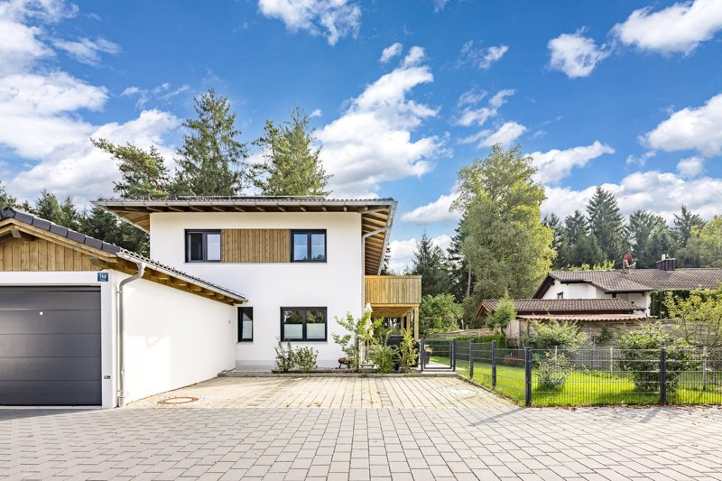 Die Beschreibung passt gleichermaßen für das 2022 in Massivbauweise fertiggestellte Haus mit Garten. Es ist das passende Zuhause für eine Familie mit zwei und auch drei Kindern. Man sieht viel Grün, schaut auf Berge und draußen auf der Terrasse schnuppert man den Duft vom angrenzenden Wald.