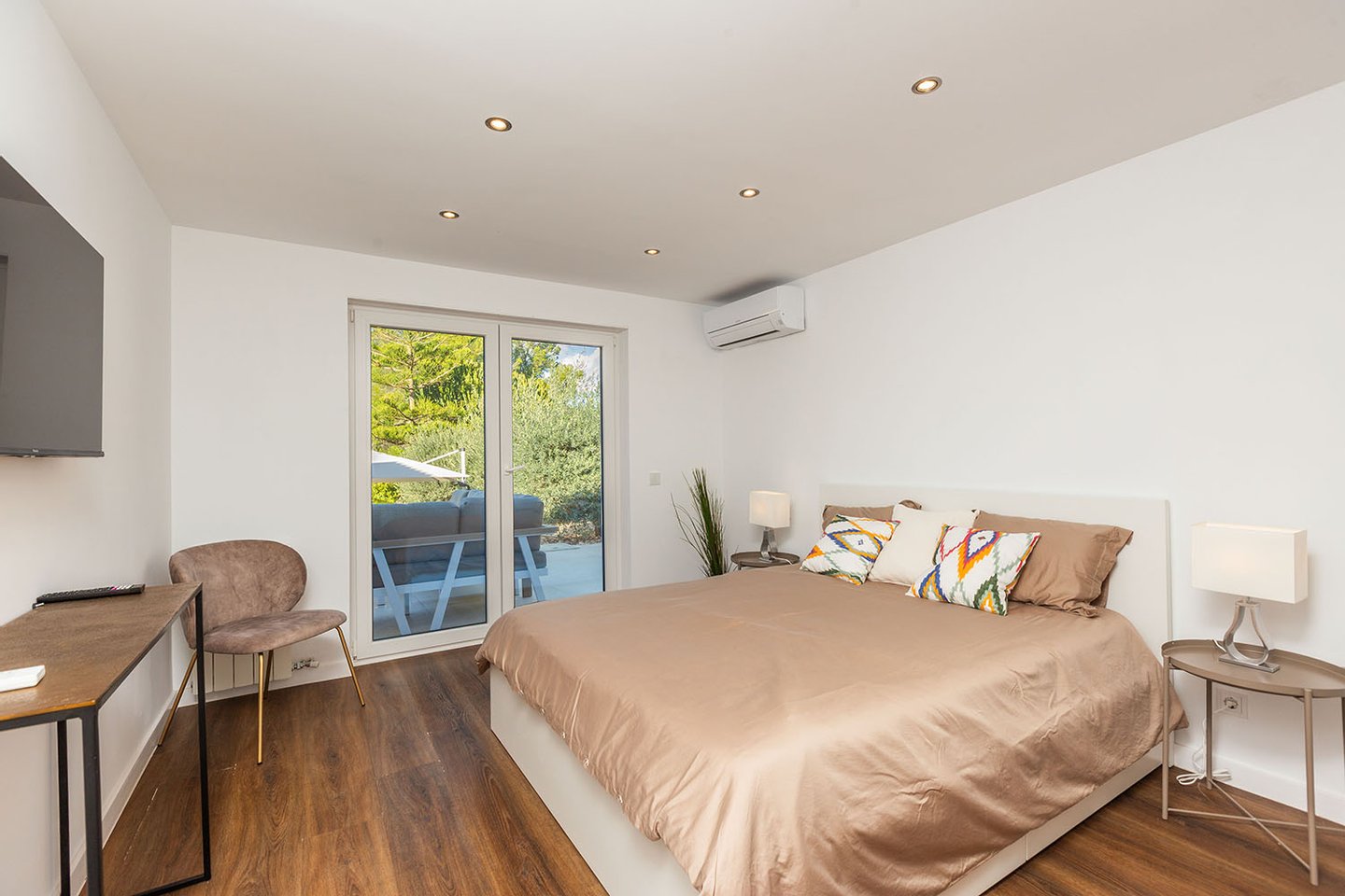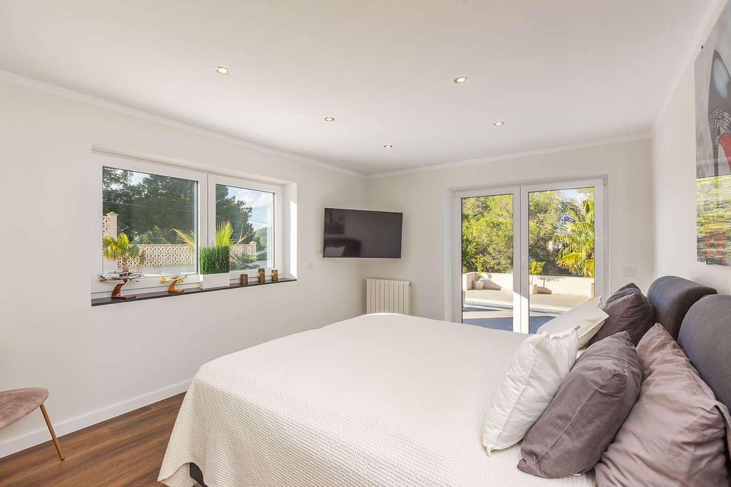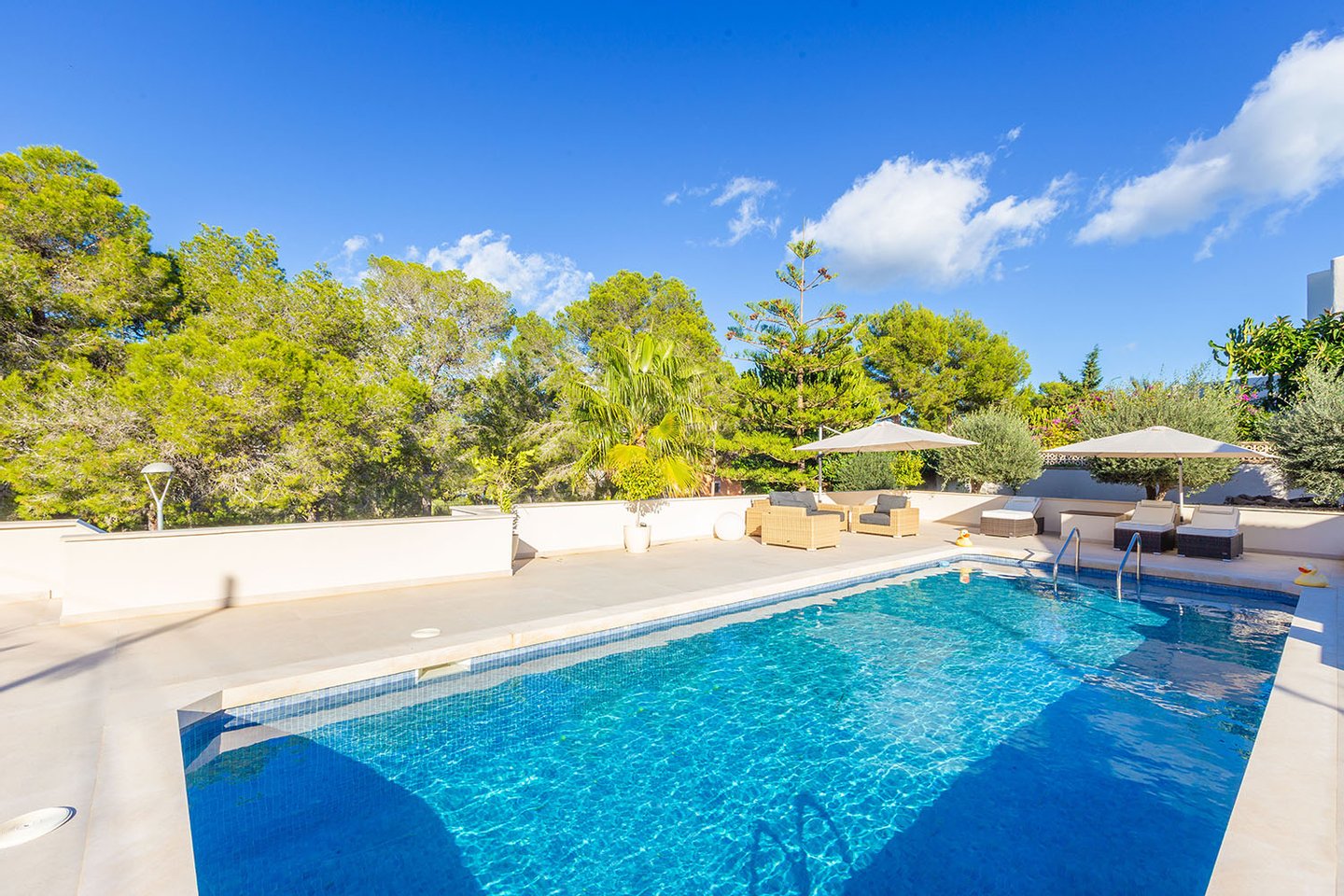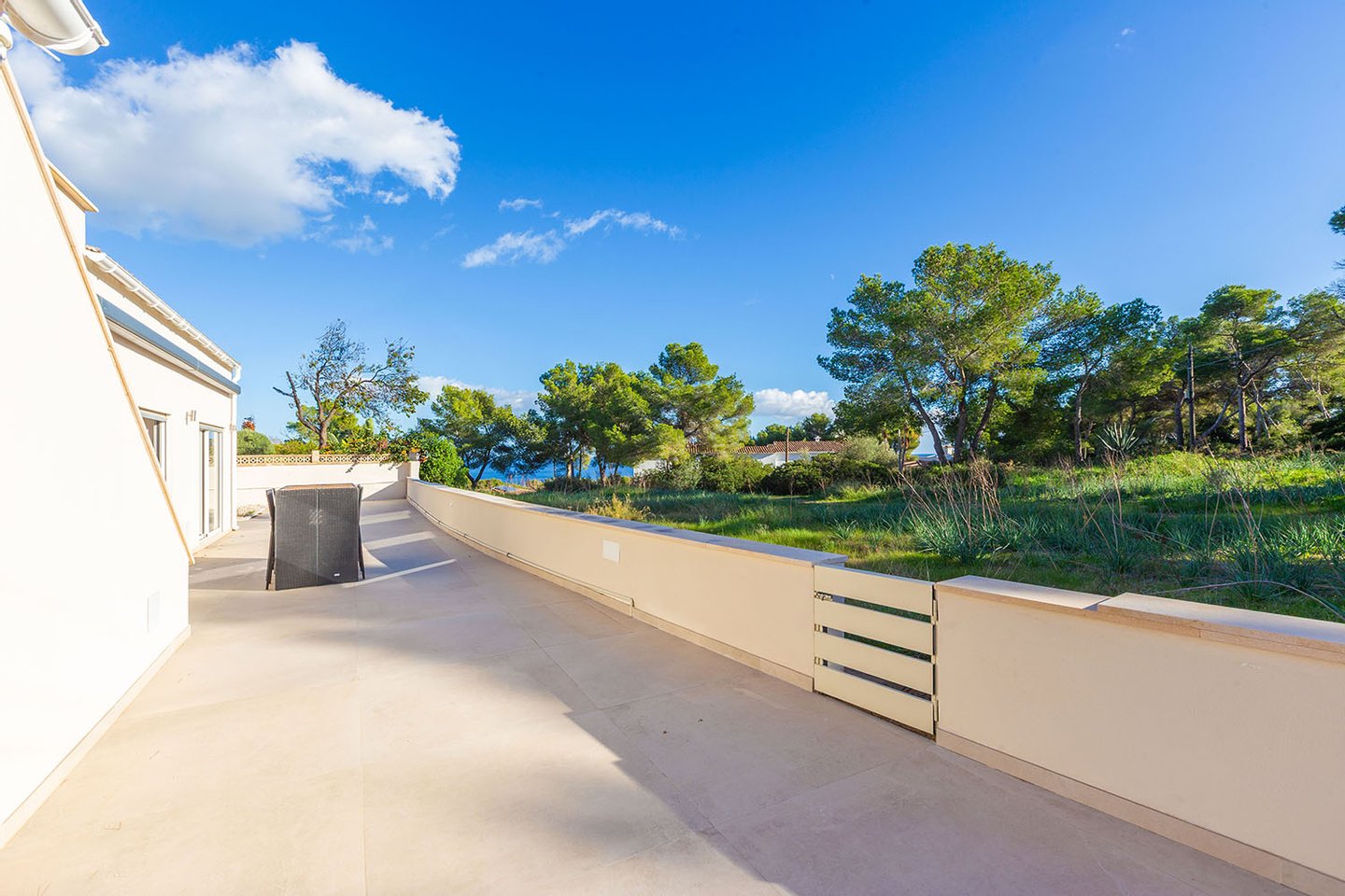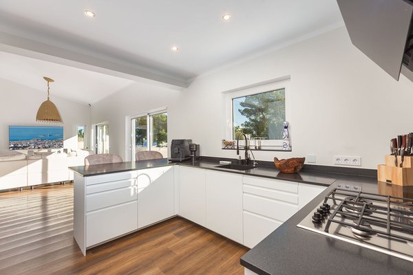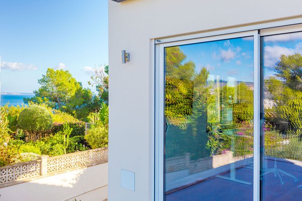 Das Grundstück eröffnet unterschiedliche schöne Ausblicke: Zu einer Seite fällt der Blick auf die nahe Berglandschaft, zur anderen grenzt das Haus an eine geschützte Grünzone. Dort befindet sich auch eine großzügige Terrasse mit Teilmeerblick. Ein 11 x 5 Meter großer Pool, weitere weitläufige Terrassenflächen und ein BBQ-Bereich ergänzen das Angebot.