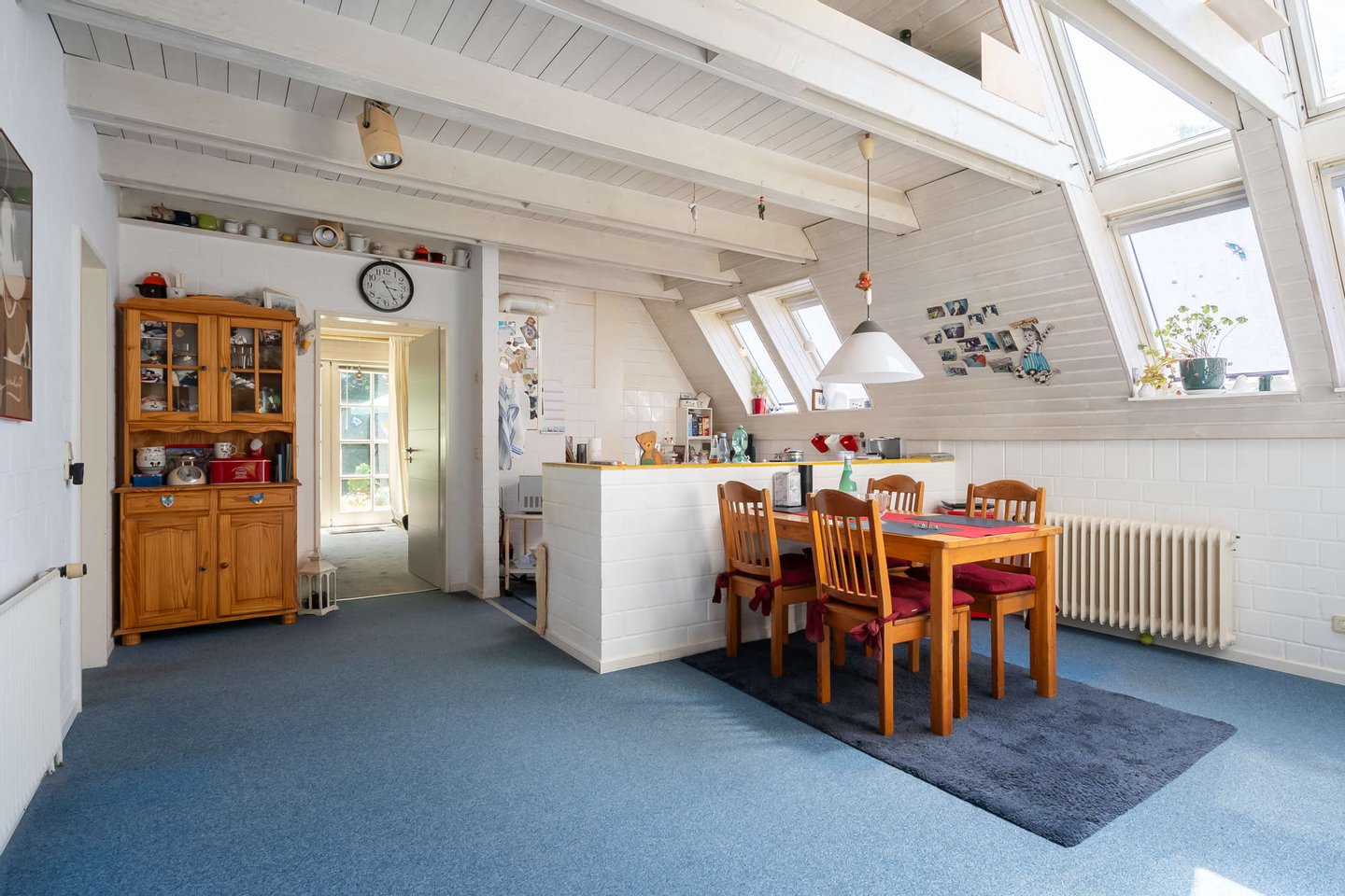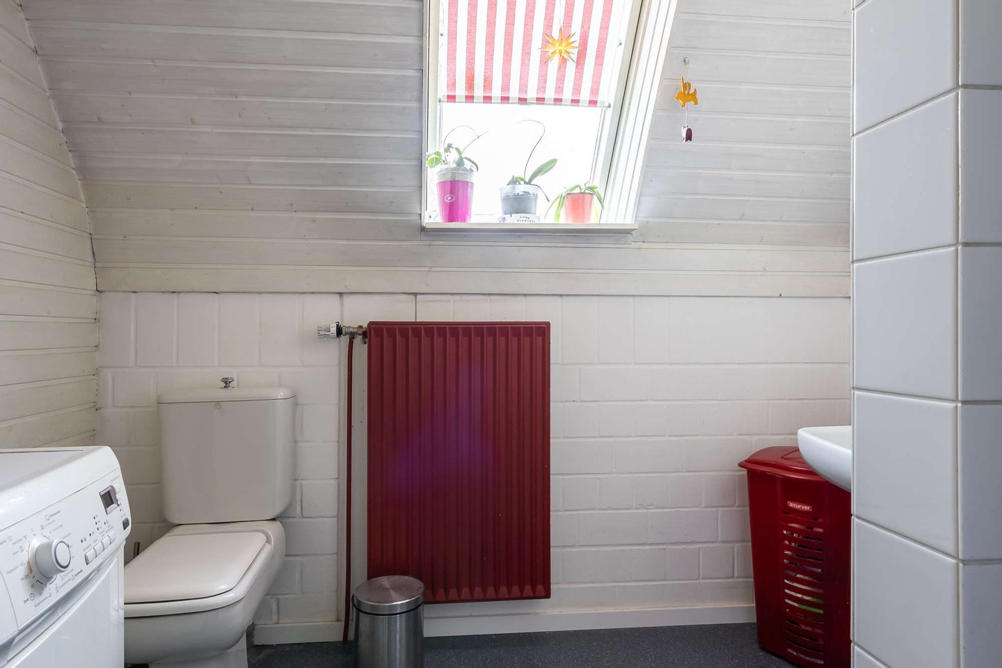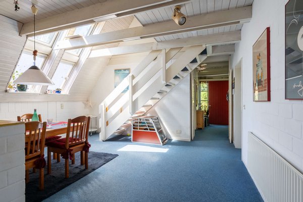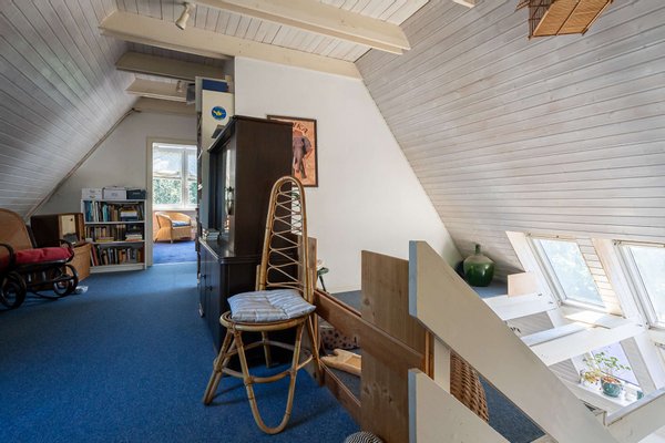 Ein offener Treppenaufgang führt ins Obergeschoss, das mit einem weiteren Schlafzimmer, einem zweiten Badezimmer sowie einem großzügigen Büroraum ausgestattet ist. Der Luftraum über dem Wohnbereich sorgt für eine offene, luftige Atmosphäre und verbindet beide Etagen architektonisch auf elegante Weise.