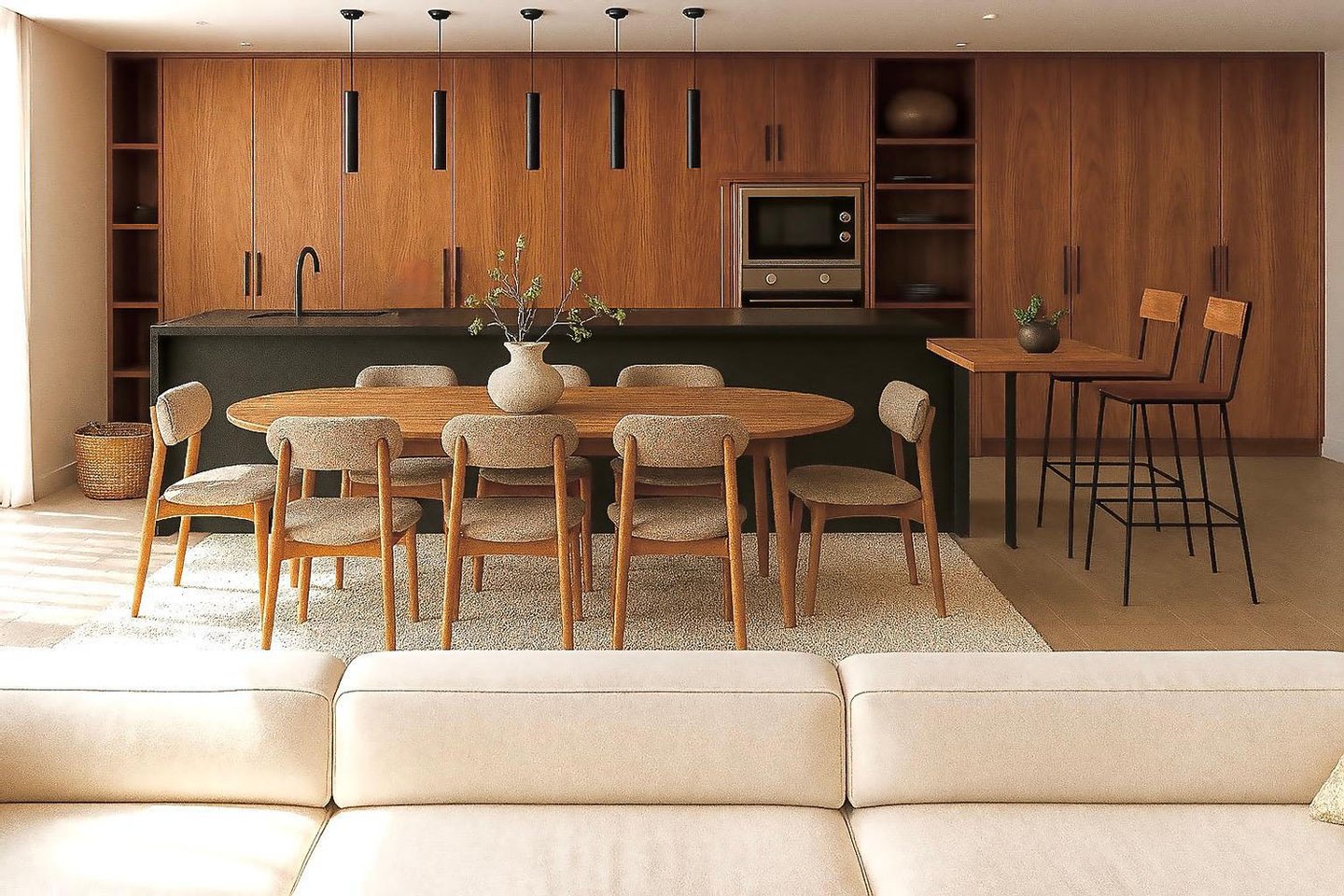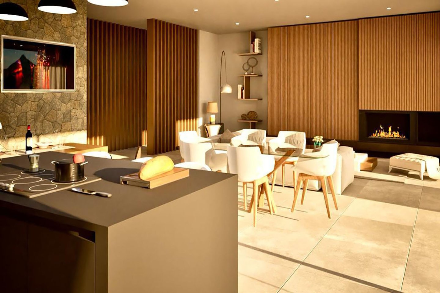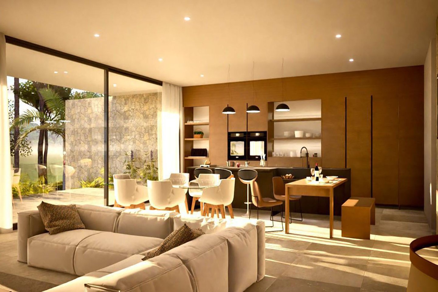 Im Innenbereich sind fünf großzügige Schlafzimmer mit jeweils en-suite Badezimmern und eigenen Terrassen geplant. Der offene Wohnbereich ist mit einer hochwertigen, modernen italienischen Küche ausgestattet, einschließlich Gaggenau-Geräten und Weinkühlschrank. Weitläufige, teils überdachte Terrassen gehen nahtlos in den Außenbereich über und führen zum Salzwasserpool mit einer Größe von etwa 40 m². Eine Garage für bis zu drei Fahrzeuge komplettiert das Angebot.