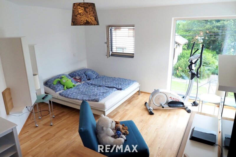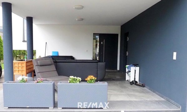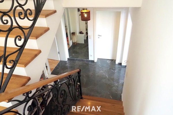 Im überdachten Zugangsbereich betreten Sie das Gebäude. Im Erdgeschoss dann das zentrale Vorzimmer sowie der Stiegenaufgang, das erste Bad und auch noch das äußerst helle Wohnzimmer, mit dem Ausgang auf die erste sehr große Terrasse, und der Küche im Anschluss. Der Technikraum befindet sich ebenfalls im EG.