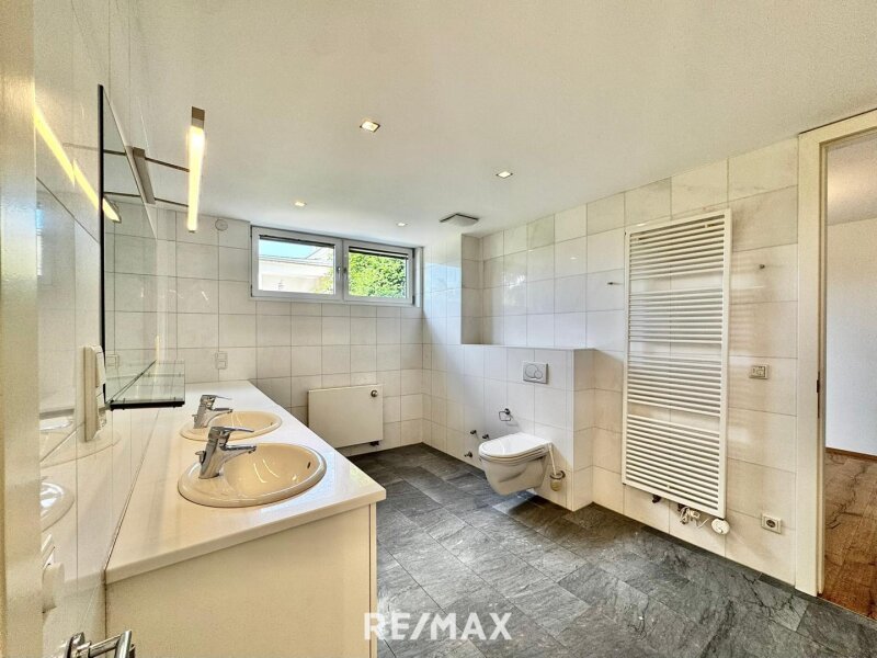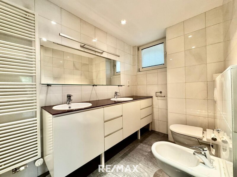 Auf der vom Eingang gesehen rechten Seite der Wohnung finden wir zwei weitere geräumige Zimmer, die durch ein gemeinsames Badezimmer miteinander verbunden sind. Doppelwaschbecken, Badewanne sowie eine separate Duschkabine findet sich hier gleichermaßen wie eine Toilette und der Anschluss für eine Waschmaschine. Das vordere der beiden Zimmer hat ebenfalls einen Ausgang auf die Terrasse und den Garten.