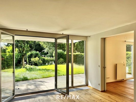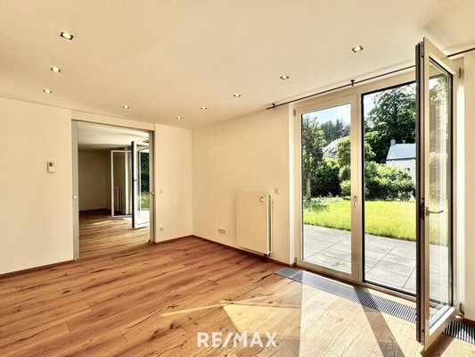 Von hier gelangen wir westseitig durch eine große Flügeltüre auf die etwa 33m² große Terrasse und in den eigenen Garten. Hier kann man nach der Arbeit die Seele baumeln lassen, oder an freien Tagen die Ruhe der Gegend genießen.