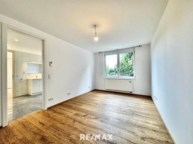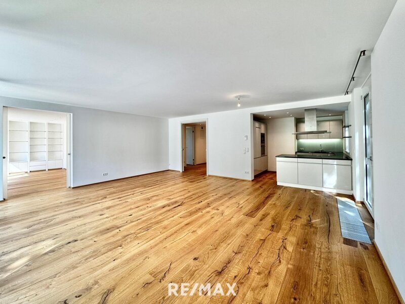 Wir betreten die Wohnung in ein großes, annähernd quadratisch geschnittenes Vorzimmer. Hier finden Sie nicht nur reichlich Platz für Ihre Garderobe, auch Ihre Gäste können Sie hier in Empfang nehmen. Durch eine breite Schiebetür gelangen wir in den ausladenden Wohn- Essbereich mit angeschlossener offener Küche. Aufgrund der vielen Glaselemente erscheint der Raum wunderbar hell und freundlich. In der gesamten Wohnung wurde ein neuer, sehr hochwertiger, Parkettboden verlegt, der den besonderen Anspruch dieser Immobilie unterstreicht.
