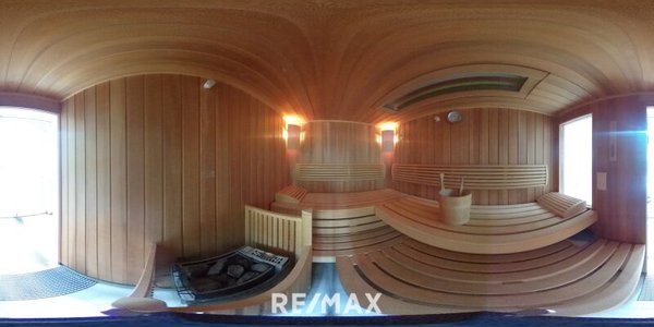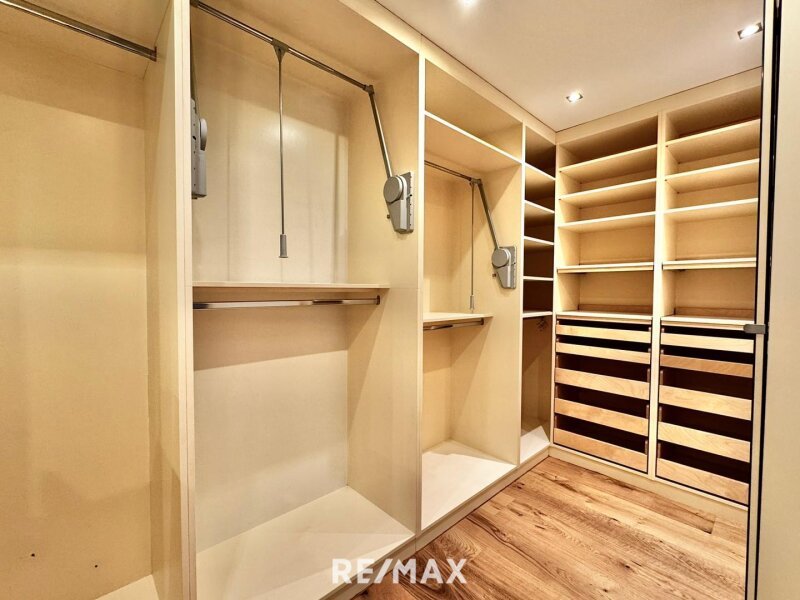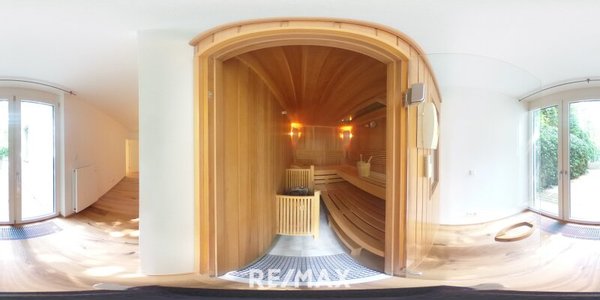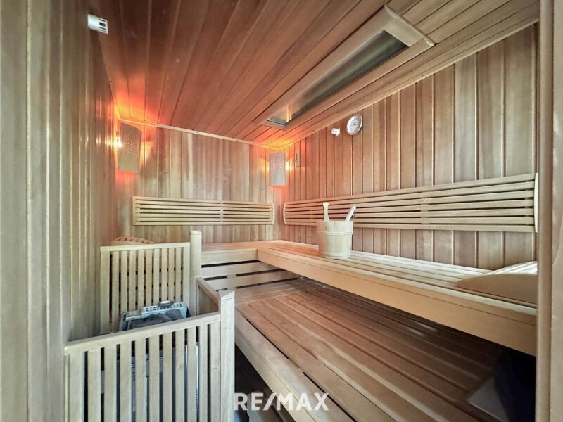 Im, dem Wohnraum gegenüberliegenden Trakt der Wohnung betreten wir den privaten Bereich. Das große Schlafzimmer, das nicht nur durch seine Ruhe, sondern auch durch seine Größe besticht ist auf der linken hinteren Seite mit einem eingerichteten praktischen Ankleideraum verbunden. Auf der rechten Seite befindet sich das zu diesem Zimmer gehörende Badezimmer mit Dusche, Doppelwaschbecken, Bidet und Toilette. Das Highlight ist aber die im Raum befindliche hochwertige Sauna mit Blick auf den seitlichen Teil des Gartens. Natürlich kann man auch von hier in den Garten gelangen. Nicht nur das - gleich an der Hauswand ist eine Dusche im Freien angebracht, hier kann man herrlich das kalte Wasser nach dem Saunagang an uneinsehbarer Stelle genießen.