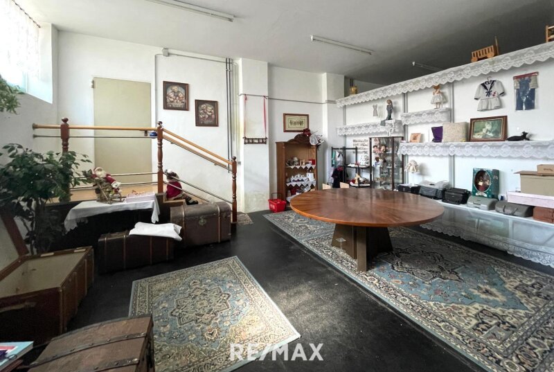 - Erdgeschoss: Geschäftslokal (ca. 12 m²), Werkstatt/Hobbyräume (ca. 370 m²), Garage & Carport (3 Stellplätze)