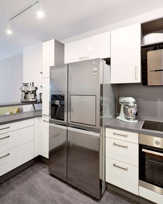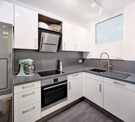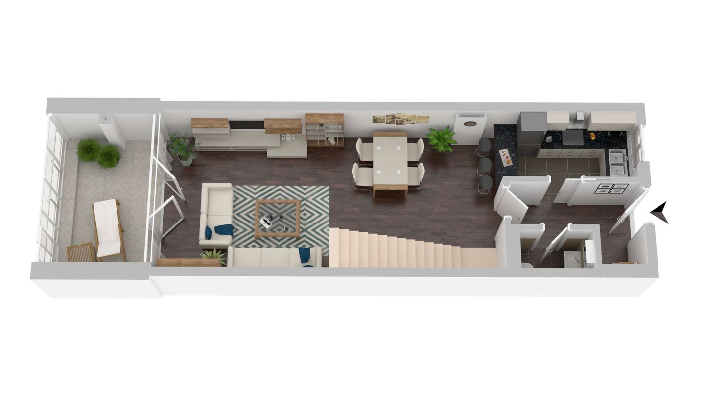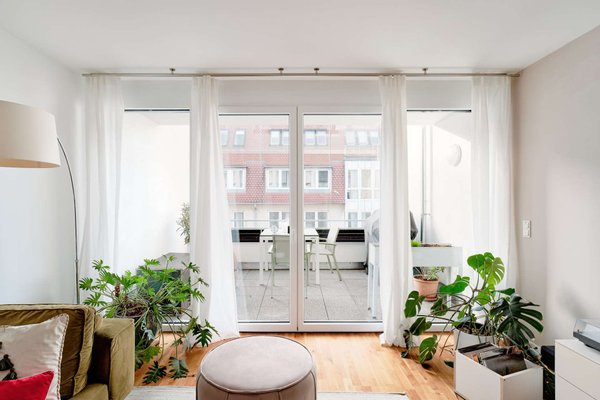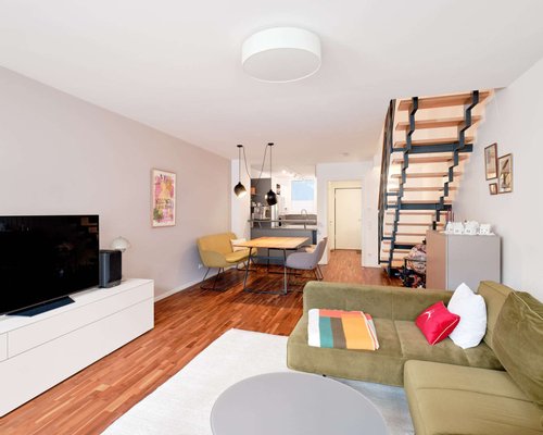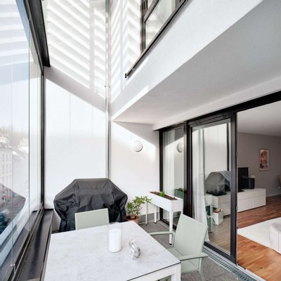 Im unteren Teil, der zum Verkauf stehenden Wohnung, befindet sich das großzügige Wohnzimmer mit ca. 34m² und angrenzender Loggia/Wintergarten mit einer Glasfassade über beide Ebenen. Des Weiteren befindet sich hier die zum Wohnzimmer hin offene Küche mit modernen Geräten und einer kleinen Theke sowie neben dem Eingang das Gäste-WC.