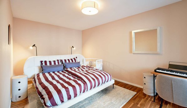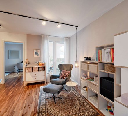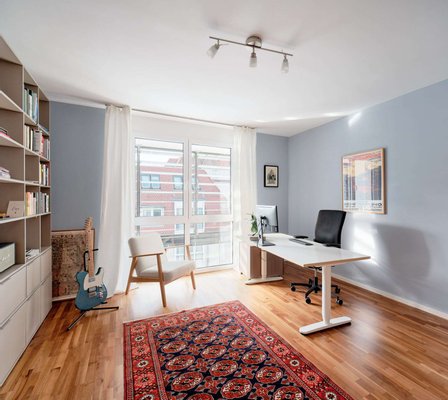 Im oberen Teil der Wohnung befinden sich das hochwertige Bad mit Wanne und bodentiefer Dusche sowie drei weitere Zimmer und einen an zwei Zimmer angrenzenden, zum schön angelegten Innenhof (begrünt mit gemeinschaftlicher Nutzung) ausgerichteten, Balkon als auch einen kleinen Hauswirtschaftsraum mit Platz für Waschmaschine und Trockner vor. Dabei trumpfen vor allem das Schafzimmer sowie das an den Wintergarten grenzende Zimmer mit heller und freundlicher Atmosphäre auf. Das Dritte Zimmer, welches eine Art Vorzimmer für das Schlafzimmer ist, eignet sich dabei bestens als Arbeits- und Ankleidezimmer.
