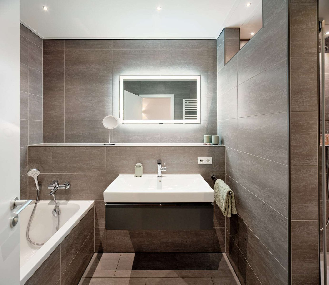 + modernes Badezimmer mit bodengleicher Dusche und Badewanne