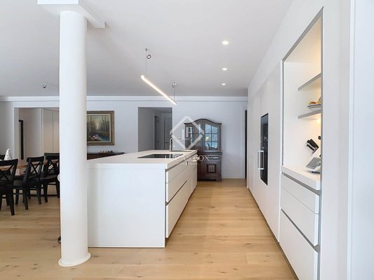 Beim Betreten der Wohnung finden Sie eine komfortable Eingangshalle mit eingebauten Kleiderschränken, die zum Tagesbereich führen: ein helles und geräumiges, offenes Esszimmer, ein Wohnzimmer mit Kamin und eine moderne, voll ausgestattete offene Küche mit zentraler Insel und ausreichendem Stauraum. Ein bequemer, separater Waschbereich vervollständigt den Raum.