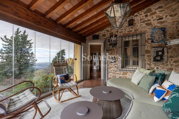 Auf den malerischen toskanischen Hügeln mit Blick auf das Meer der Versilia erhebt sich eine herrschaftliche Villa aus dem 16. Jahrhundert, eingebettet in einen