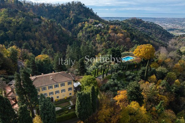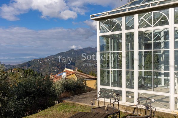Auf den malerischen toskanischen Hügeln mit Blick auf das Meer der Versilia erhebt sich eine herrschaftliche Villa aus dem 16. Jahrhundert, eingebettet in einen prächtigen privaten Park mit Olivenhain.
