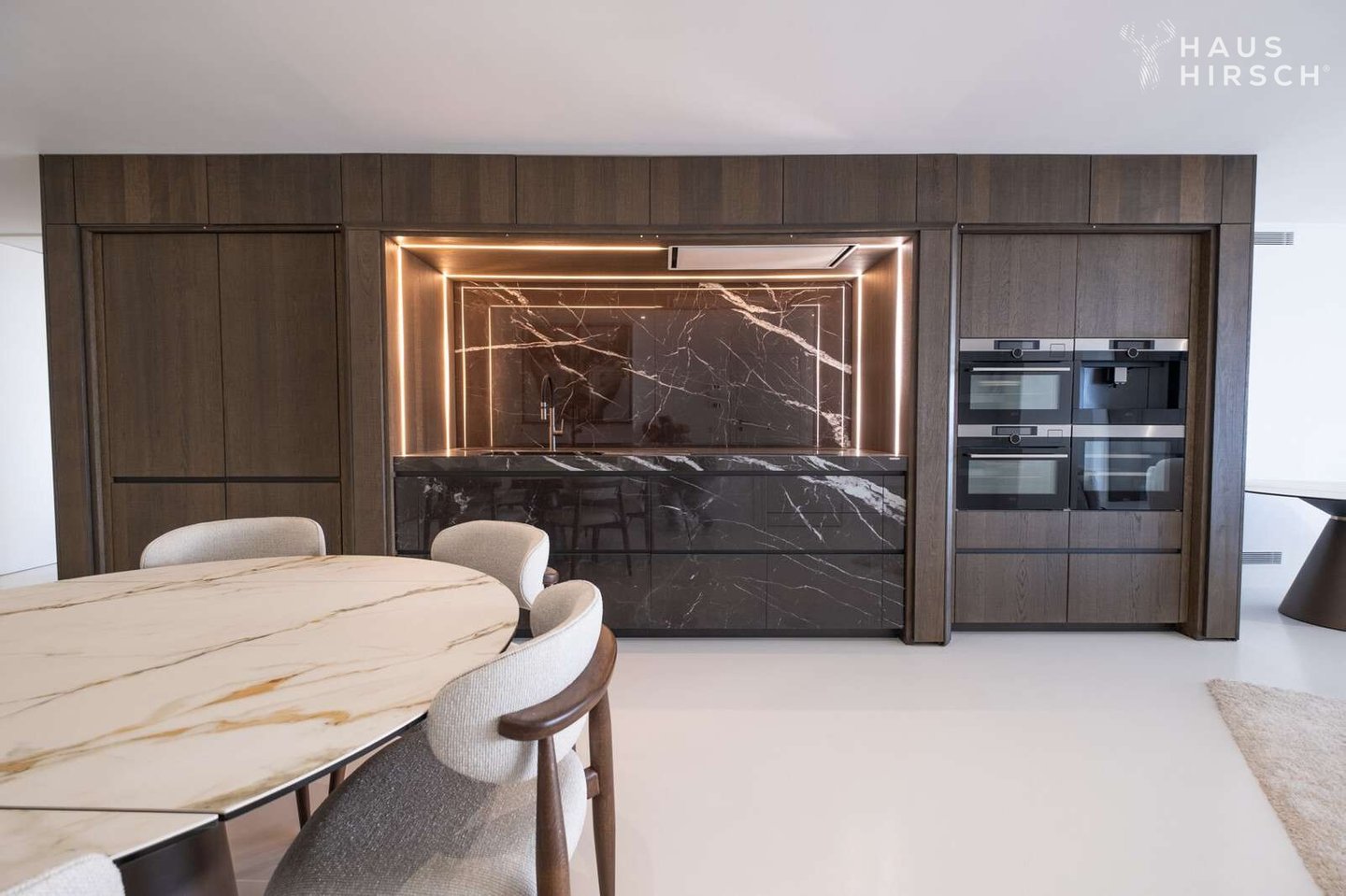 Der offene Wohn-Esszimmer-Bereich mit moderner, offener Küche lädt zum Verweilen ein. Der geräumige offene Wohn-, Ess- und Küchenbereich bietet Zugang zur Terrasse und ermöglicht ein nahtloses Innen-Außen-Wohn-Erlebnis mit einem atemberaubenden Panorama über den Hafen.