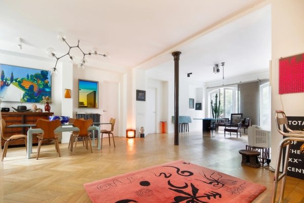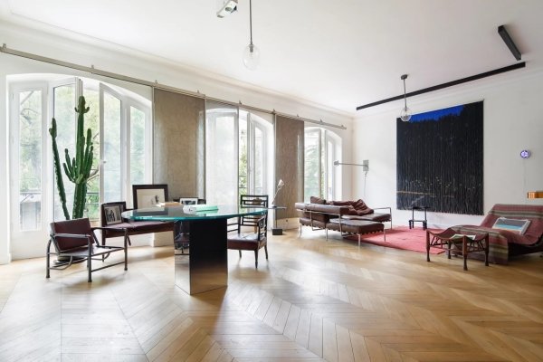 In an old building, on the 1st floor with elevator, a bright apartment of 171 m2 Carrez (174 m2 on the ground) completely renovated, like a loft, with high ceilings, comprising: