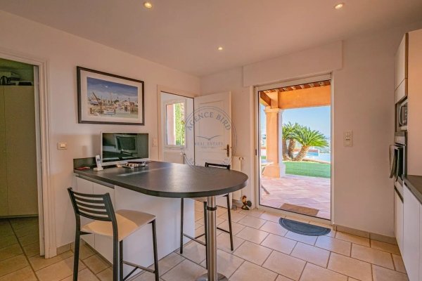Das Hauptgeschoss, das zum Mittelmeer und zum Infinity-Pool hinausgeht, bietet hervorragende Volumen: ein hellerfülltes Wohnzimmer mit Kamin, ein elegantes Esszimmer, eine voll ausgestattete Küche mit erweitertem Hauswirtschaftsraum sowie eine Master-Suite mit Badezimmer und Umkleideraum. Der gesamte Raum fließt natürlich auf die Terrassen, den angelegten Garten und den Boulesplatz über, perfekt zum Entspannen am Ende des Tages.