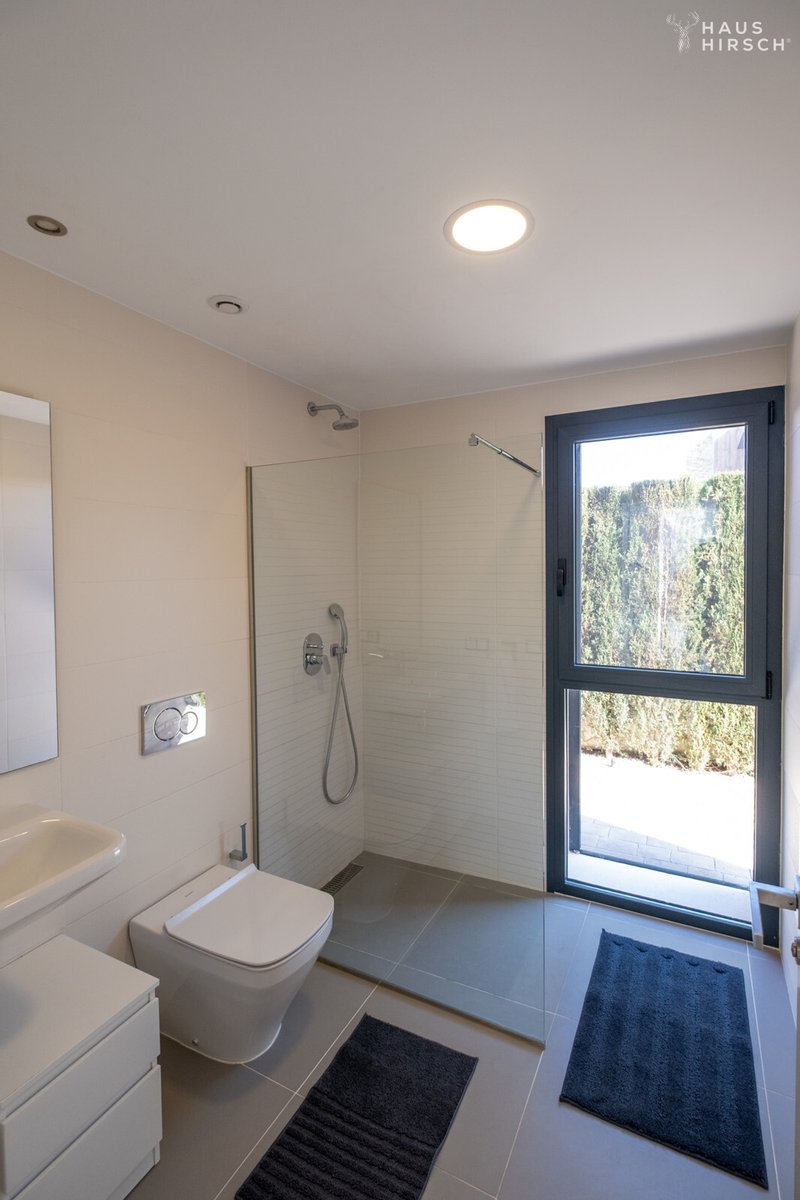 Die Badezimmer verfügen über Fußbodenheizung, die individuell regelbar ist. Zusätzlich hat das Haus Smarthome-Technologie Möglichkeiten, sodass Sie einige Funktionen bequem auch aus der Ferne steuern können. Es stehen Ihnen zwei große Badezimmer zur Verfügung, eines davon En Suite mit einer sehr schönen großen Dusche, Doppelwaschbecken und separatem WC.