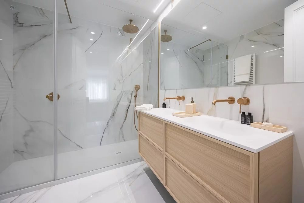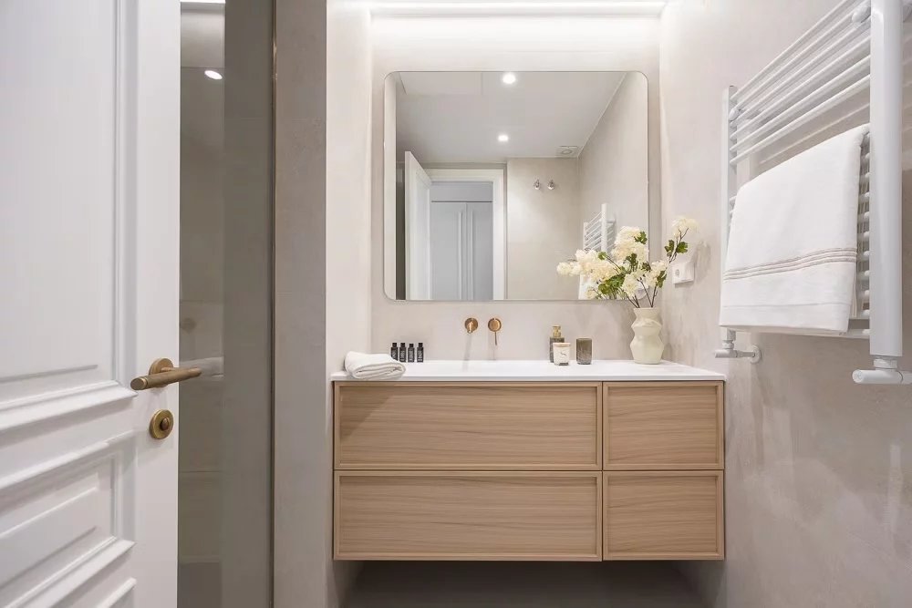 Das Apartment bietet vier geräumige Schlafzimmer, jeweils mit eigenem Bad, sodass jeder Bewohner einen privaten und perfekt ausgestatteten Rückzugsort genießen kann. Ein separater Eingangsbereich bietet Platz für stilvolle Gästeempfänge. Die Wohnung verfügt über eine zentrale Klimaanlage und Heizung, die ganzjährig für ein angenehmes Raumklima sorgen.