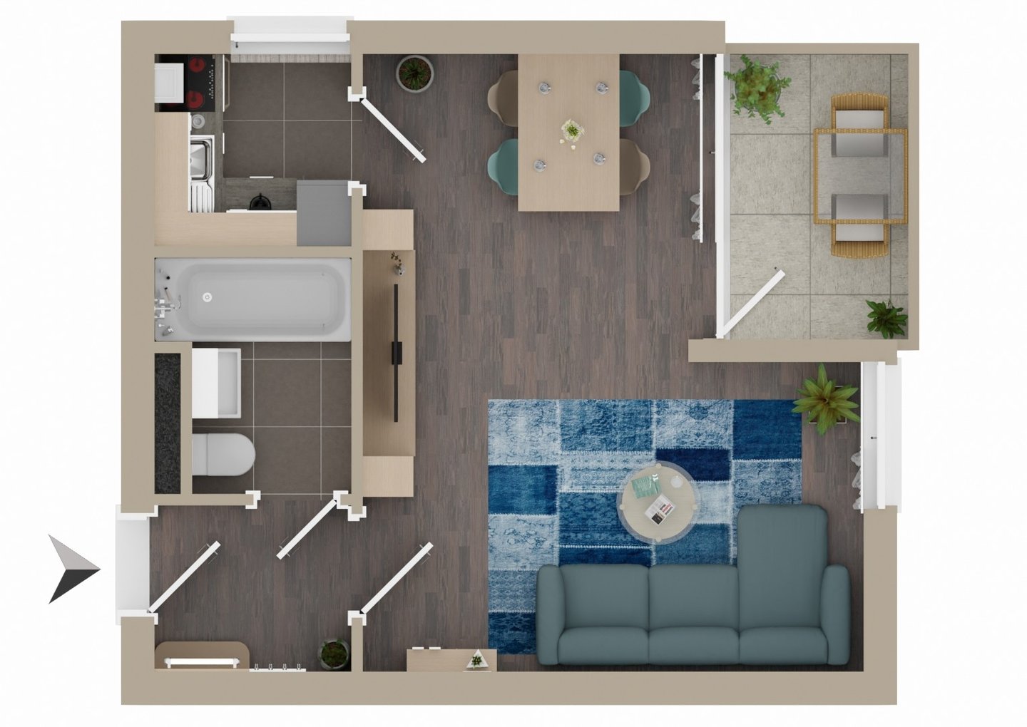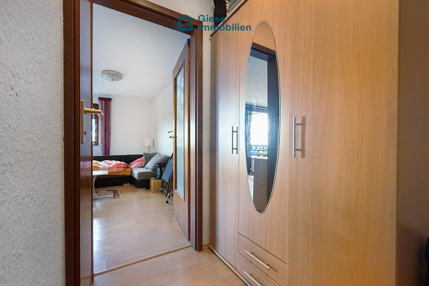 Die Wohnung überzeugt durch ihren klar strukturierten Grundriss: Ein praktischer Flur verbindet alle Räume miteinander, der helle Wohn- und Schlafbereich bietet vielfältige Einrichtungsmöglichkeiten, und der überdachte Balkon erweitert den Wohnraum sinnvoll nach außen. Besonders hervorzuheben ist die vollständig abgetrennte Küche – ein Ausstattungsmerkmal, das in dieser Wohnungsgröße selten ist und von Mietern sehr geschätzt wird. Das gepflegte Badezimmer mit Badewanne, Waschbecken und Spiegelschrank rundet das funktionale Gesamtbild ab.