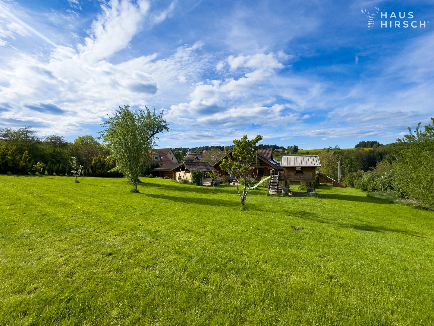 Die Außenanlagen lassen keine Wünsche offen: Ein charmantes Saunahaus aus Naturstammholz (ca. 36 m²) lädt zum Entspannen ein, während ein geräumiger Carport sowie zusätzliche Parkmöglichkeiten den Fahrzeugen ausreichend Platz bieten. Für Hobbyprojekte und handwerkliche Tätigkeiten steht eine Garage/Werkstatt zur Verfügung. Eine Grillhütte und ein Kinderspielhochhaus ergänzen das Angebot, während großzügige Sonnenterrassen und eine weitläufige, grüne Wiese mit vielfältigem Baumbestand ideale Rückzugsorte im Freien bieten.