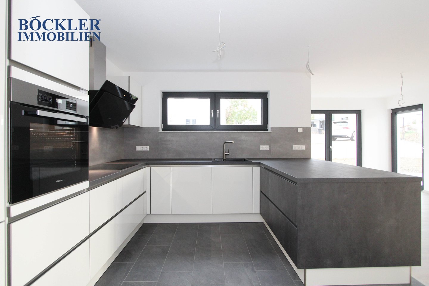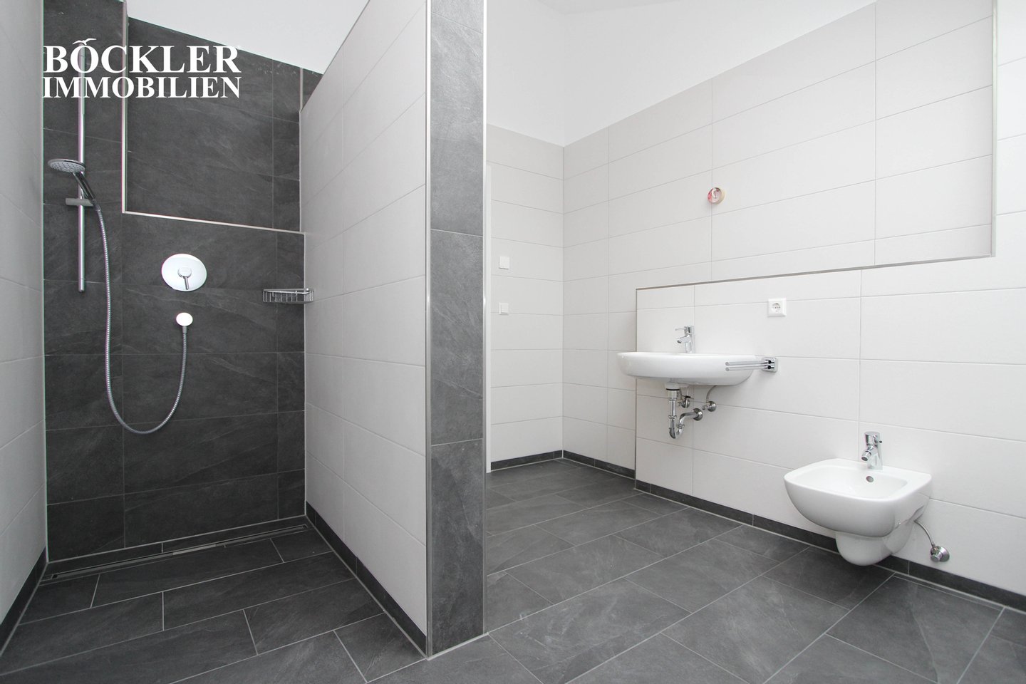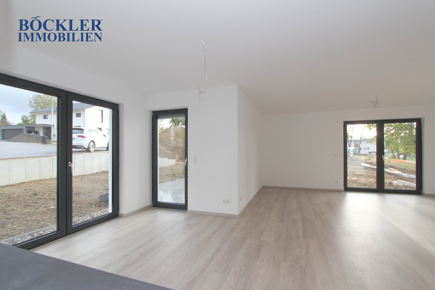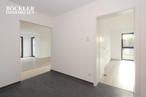 Das Erdgeschoss ist dominiert von dem großen, offenen Koch-, Wohn- und Essbereich von dem Sie auch direkt auf die, nach Süden, orientierte Terrasse gelangen. Eine große, weit öffnende Schiebetür öffnet diesen Raum zum zentralen Eingangsbereich von dem ein HomeOffice und das großzügige Duschbad mit WC erreichbar sind.