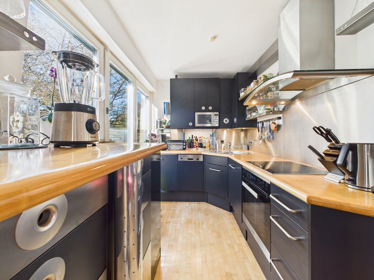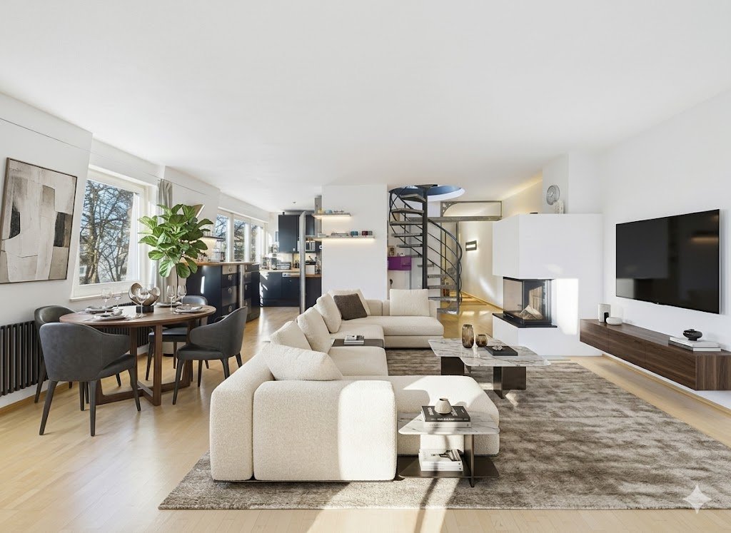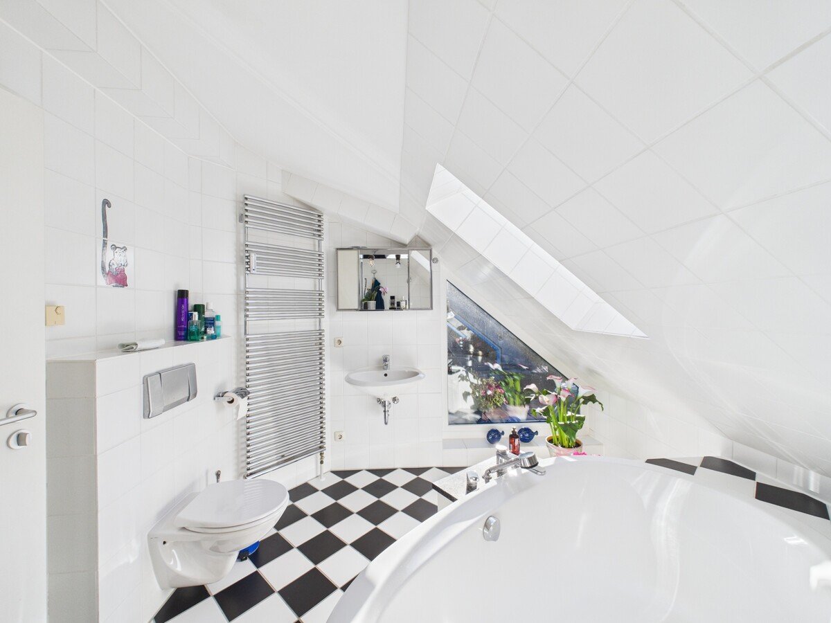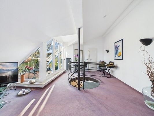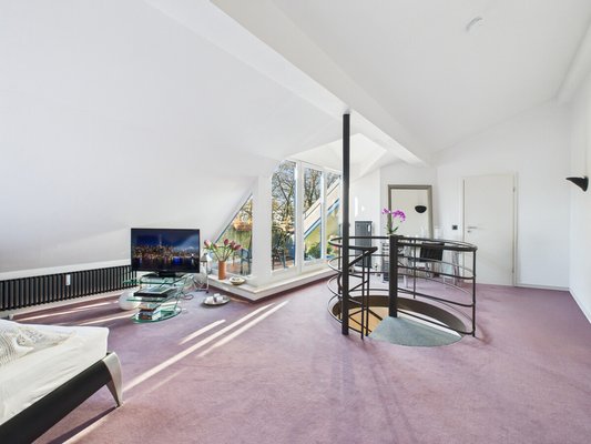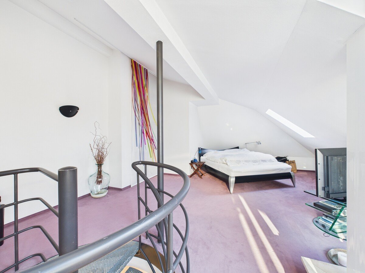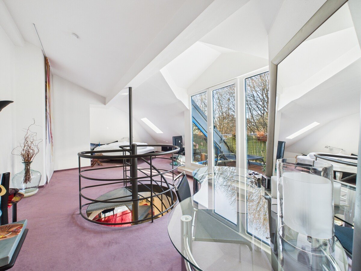 Über eine Wendeltreppe erreichen Sie das Dachgeschoss, das zusätzlich über einen separaten Zugang vom Treppenhaus verfügt. Das offene Dachstudio bietet einen großzügigen Schlafbereich, Platz für Arbeiten oder Lesen, eine Ankleide sowie ein komfortables Masterbad mit großer Wanne. Ein besonderes Highlight ist die nach Westen ausgerichtete Dachterrasse, ideal für entspannte Abendstunden.