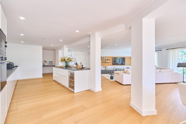* Hauptgeschoss: Ein großes und helles Wohnzimmer mit integrierter offener Küche, ausgestattet mit einer zentralen Insel und direktem Zugang zur überdachten Hauptterrasse.