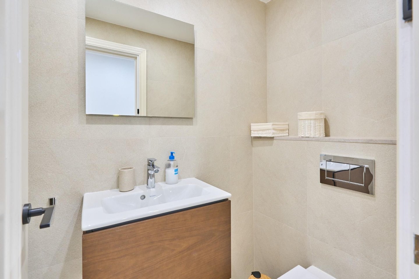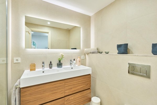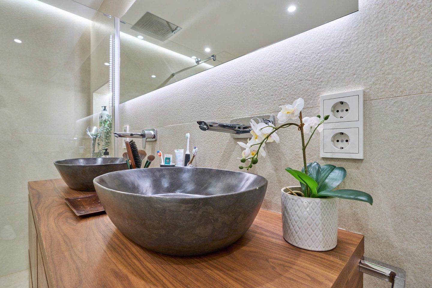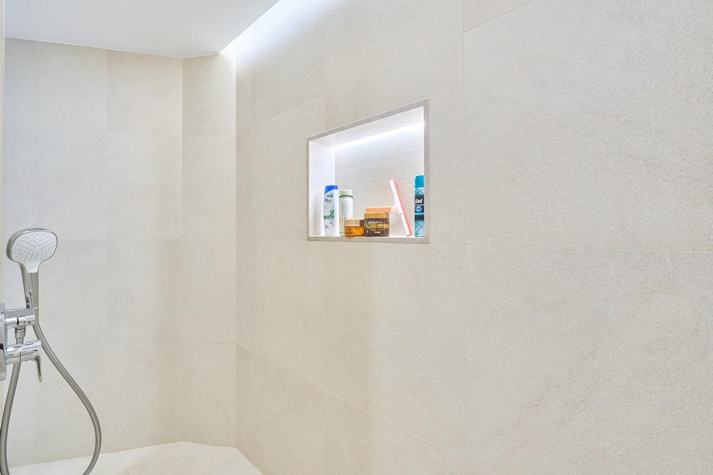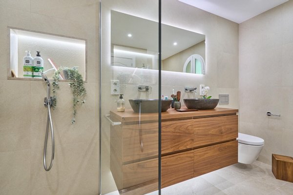 - Materialien: Parkett und Steinböden in den Badezimmern.