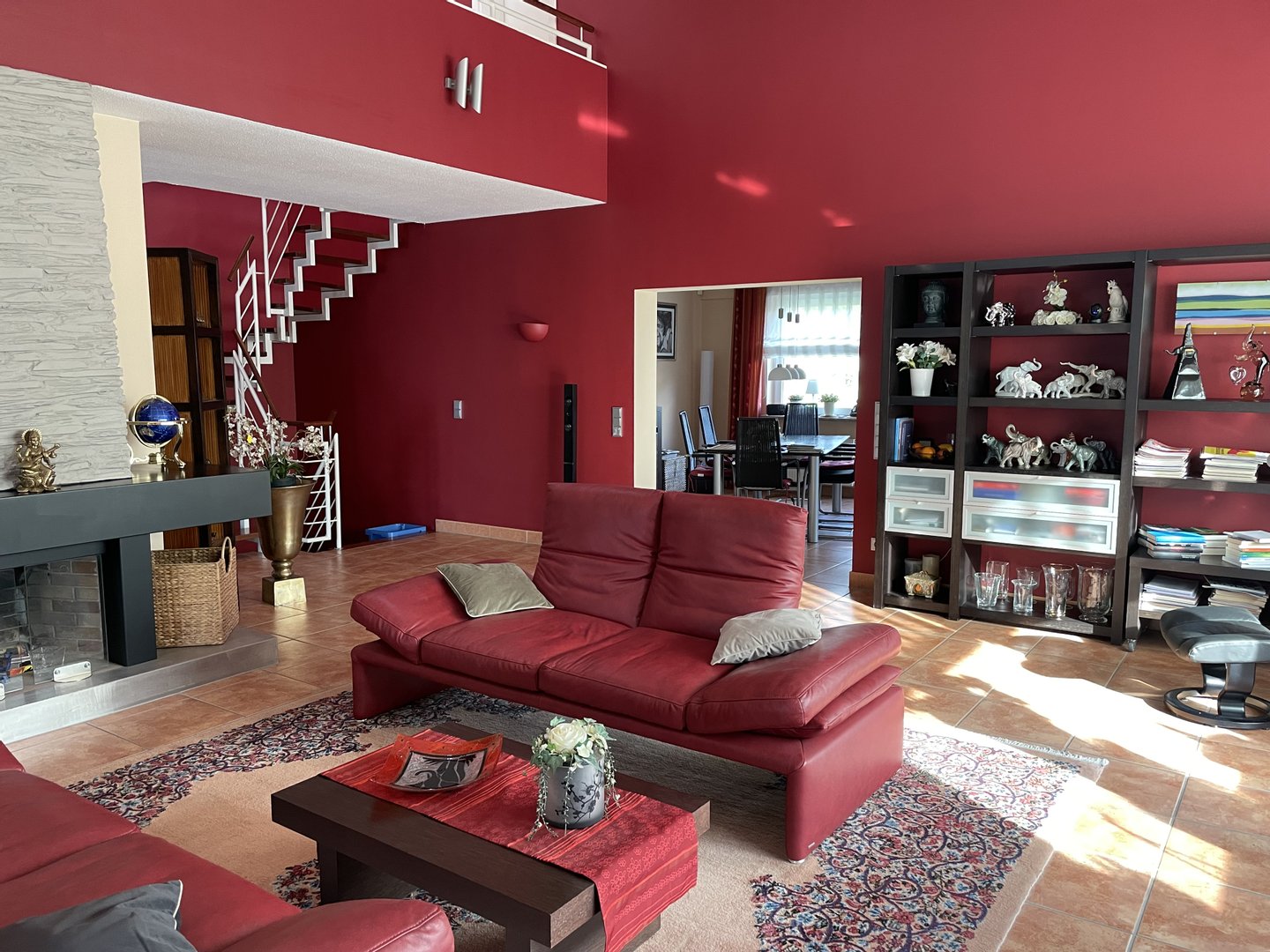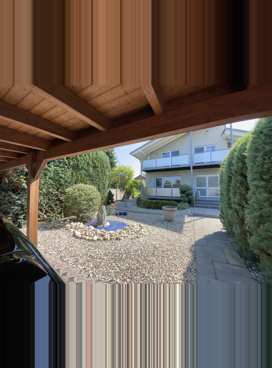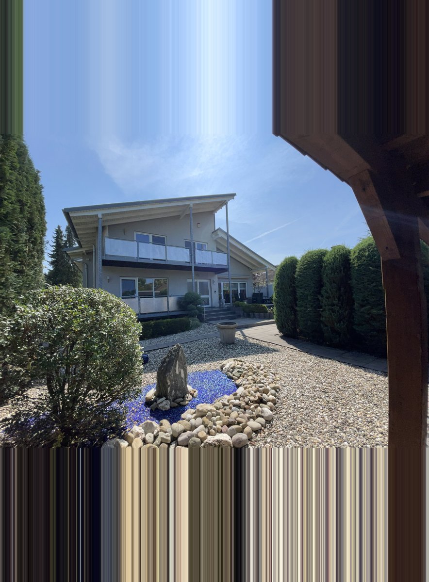 Ausstattung: Zweifamilienhaus + Einliegerwohnung mit zwei separaten Eingängen auf 673 m² Sonnengrundstück, 16 Zimmer. Umbau/Neubau 2003 mit versetztem Pultdach und moderner Architektur. Energieeffizienzklasse B (63 kWh/m²a), gehobene Ausstattung (Gutachter: 4,09/5). Galerie-Wohnzimmer mit 4,80 m Deckenhöhe und offenem Kamin. Honeywell-Alarmanlage (BUS-Technik) – alle 50 Fenster überwacht, Blockschlösser an beiden Haustüren. 2 Split-Klimaanlagen, elektrische Rollläden und Markisen, teilweise Fußbodenheizung. Voll ausgestattete Designerküche mit Markengeräten. 4-fach Carport. Mehrere Balkone, Loggia und Terrassen. Zentralheizung (Öl), 8.000 l Tank. Rundumgarten mit getrennten Zugängen zu den Wohneinheiten.