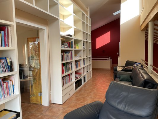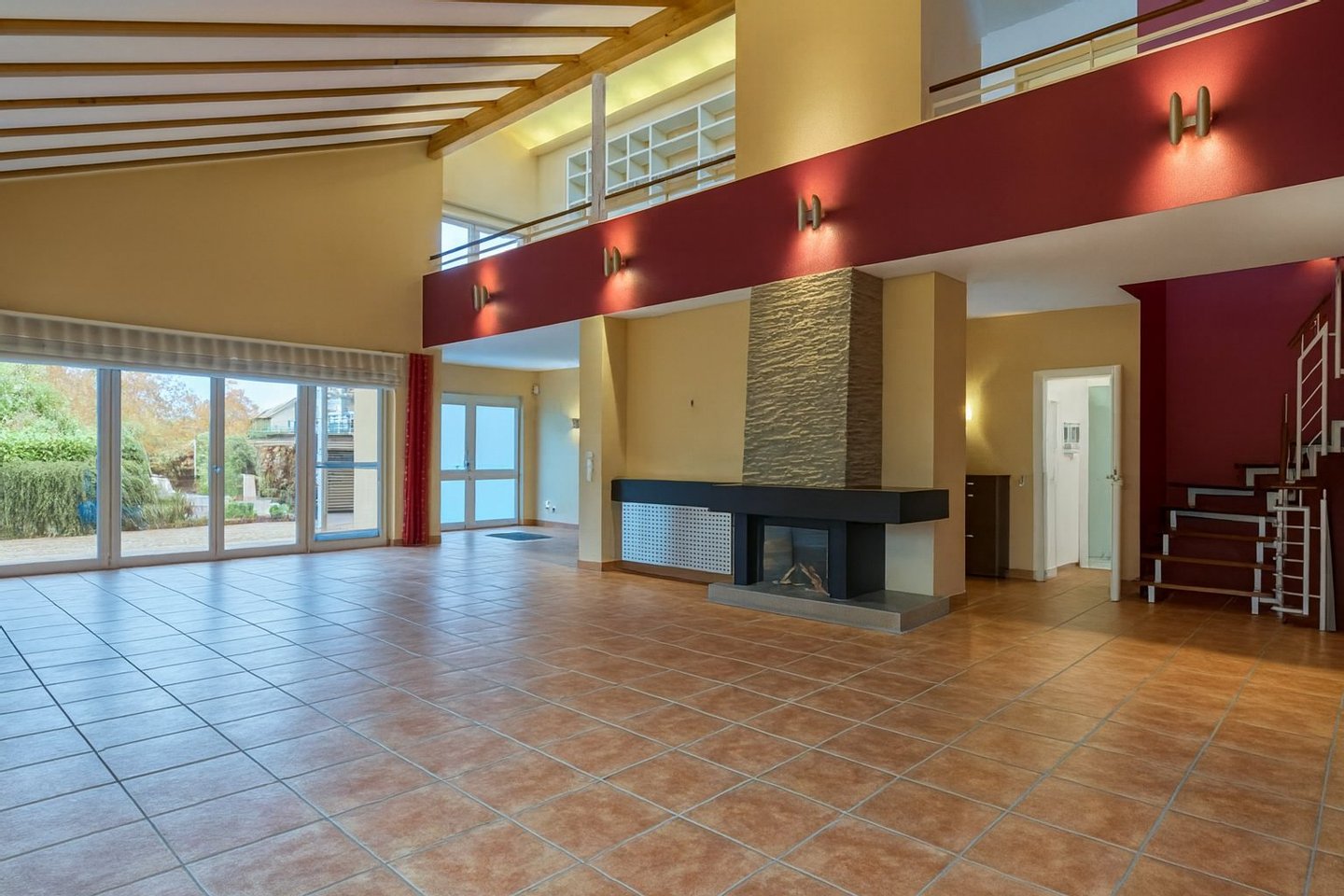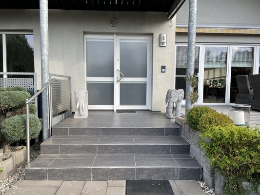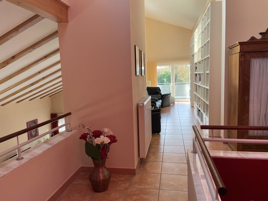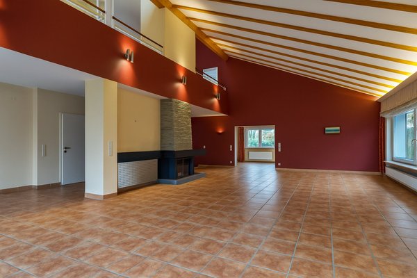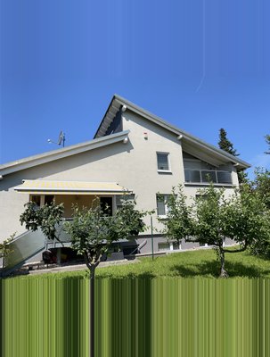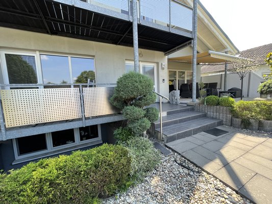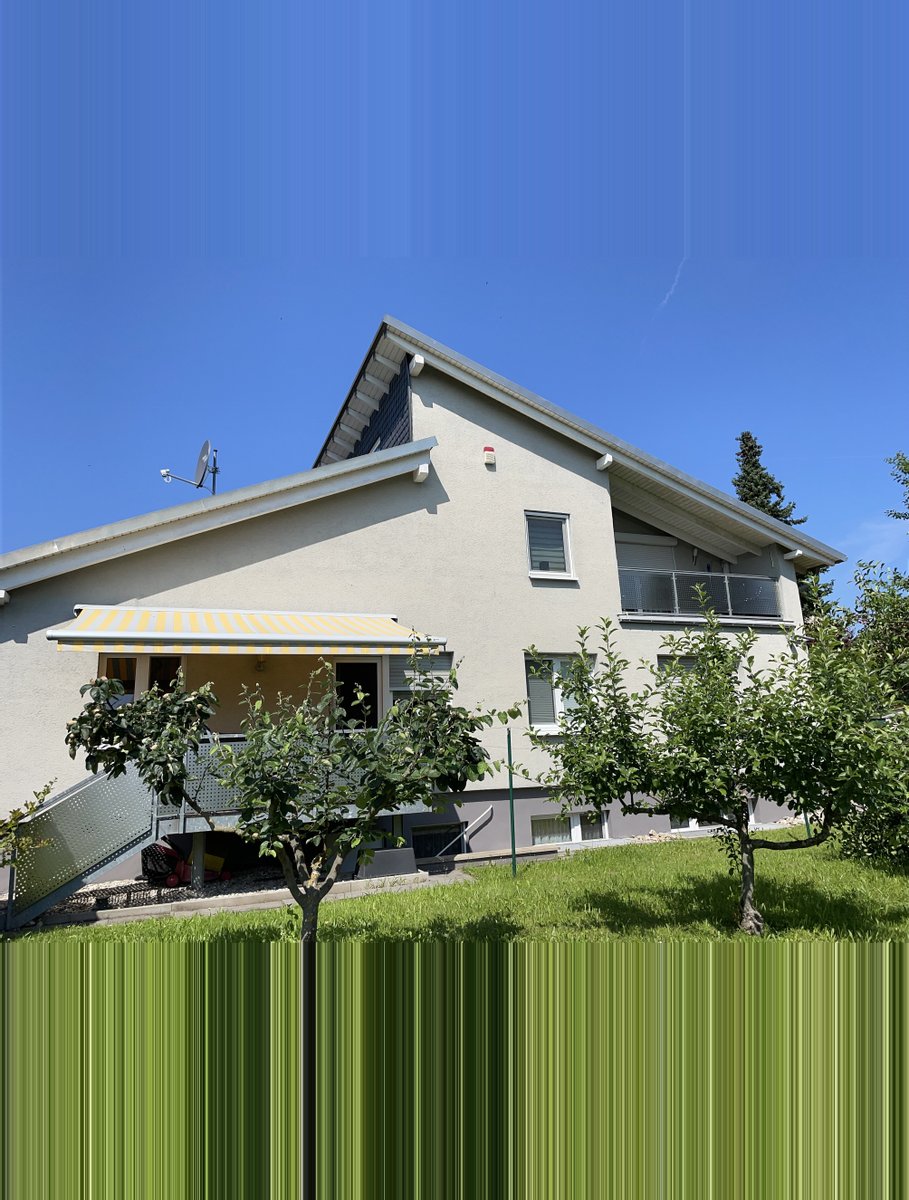 Ausstattung: Zweifamilienhaus + Einliegerwohnung mit zwei separaten Eingängen auf 673 m² Sonnengrundstück, 16 Zimmer. Umbau/Neubau 2003 mit versetztem Pultdach und moderner Architektur. Energieeffizienzklasse B (63 kWh/m²a), gehobene Ausstattung (Gutachter: 4,09/5). Galerie-Wohnzimmer mit 4,80 m Deckenhöhe und offenem Kamin. Honeywell-Alarmanlage (BUS-Technik) – alle 50 Fenster überwacht, Blockschlösser an beiden Haustüren. 2 Split-Klimaanlagen, elektrische Rollläden und Markisen, teilweise Fußbodenheizung. Voll ausgestattete Designerküche mit Markengeräten. 4-fach Carport. Mehrere Balkone, Loggia und Terrassen. Zentralheizung (Öl), 8.000 l Tank. Rundumgarten mit getrennten Zugängen zu den Wohneinheiten.