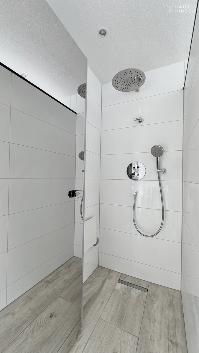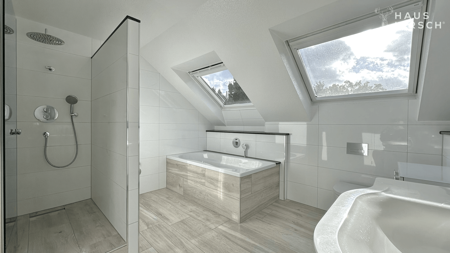Das großzügige Tageslichtbad überzeugt durch zeitloses Design, bodengleiche Regendusche, edle Armaturen und eine freistehende Wanne mit Blick in den Himmel – eine private Wohlfühloase, die den Alltag vergessen lässt.