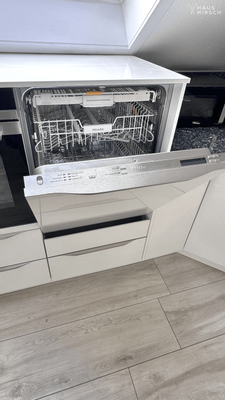 Die maßgefertigte, sehr neuwertige Design-Einbauküche mit hochglänzenden Fronten, schwarzen Granit-Arbeitsflächen und modernster Geräteausstattung, sowie XL Kühlschrank lässt keine Wünsche offen. Hier trifft Funktionalität auf Ästhetik – ein Raum, der Kochen zum Erlebnis macht. Diese wird mit vermietet.