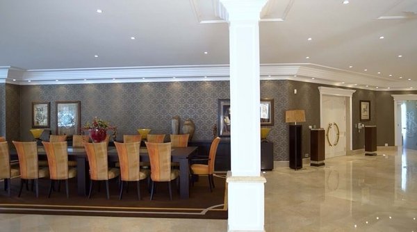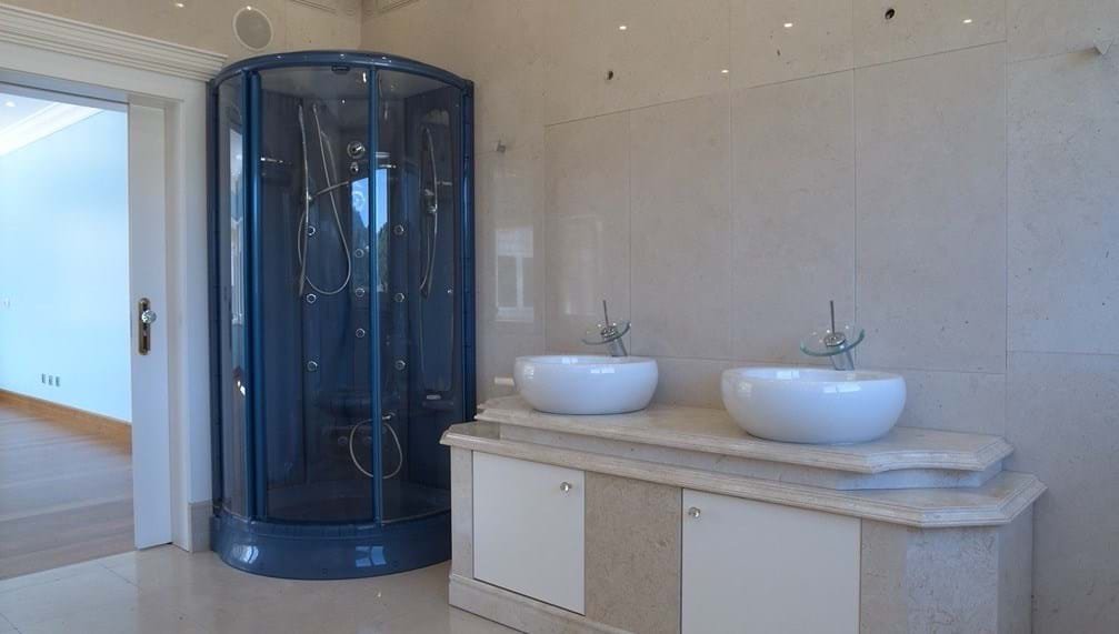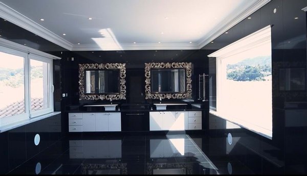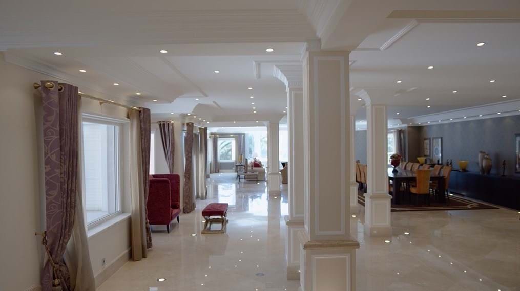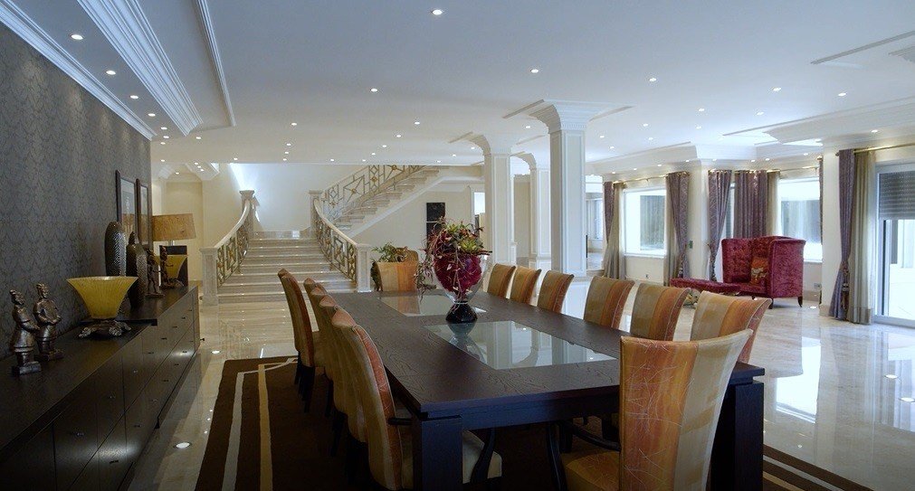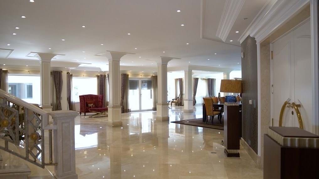 Die beeindruckende Villa befindet sich auf einer Fläche von 12.173 Quadratmetern und verfügt über ein großes Außenbad, ein Hallenbad und ein türkisches Bad. Die Garage dient für verschiedene Fahrzeuge sowie ein Kino und ein Spielzimmer zur Unterhaltung.