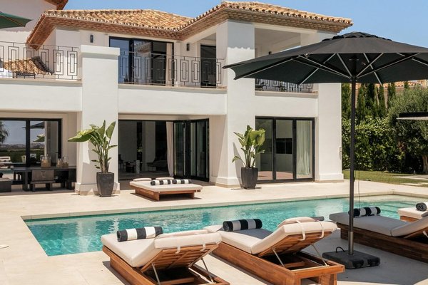 Diese beeindruckende Villa genießt den ganzen Tag über Sonnenlicht und bietet atemberaubende Ausblicke auf das Mittelmeer und den Golfplatz. Eine grüne Umrandung sorgt für maximale Privatsphäre.