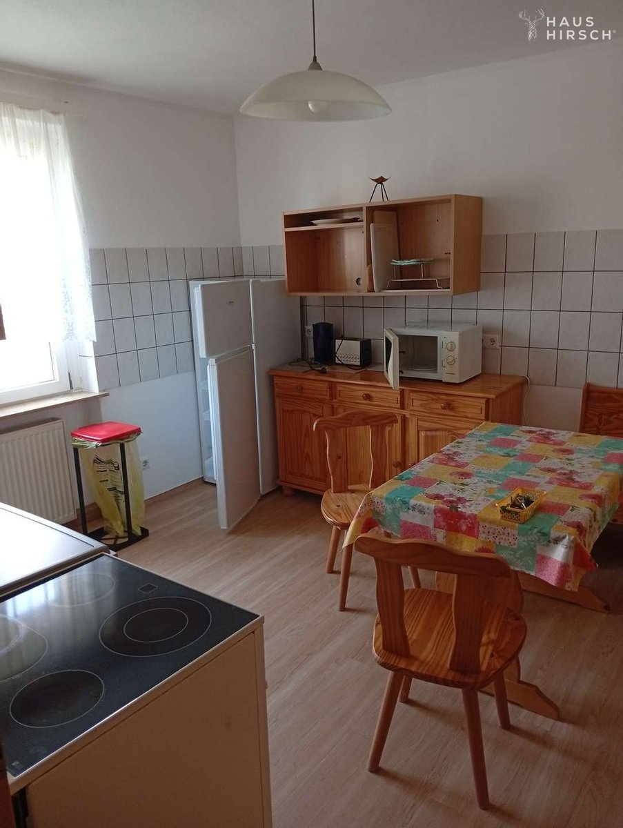 Küche mit Elektroherd, Dunstabzugshaube, Kühlschrank ,Kaffeemaschine, Wasserkocher , Toaster, Esstisch mit vier Stühlen