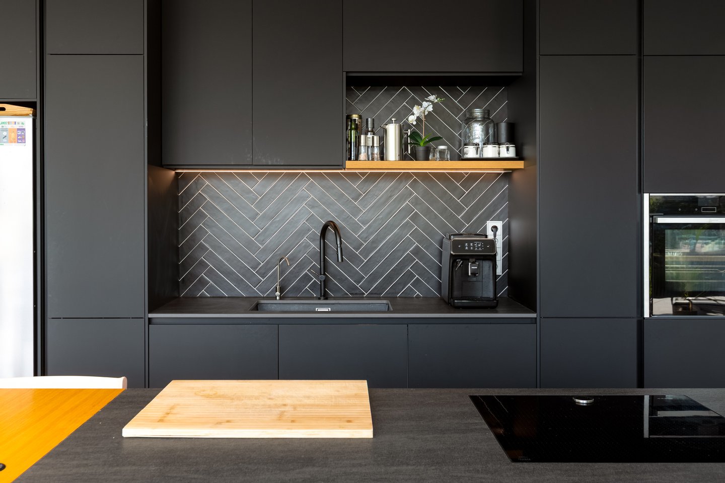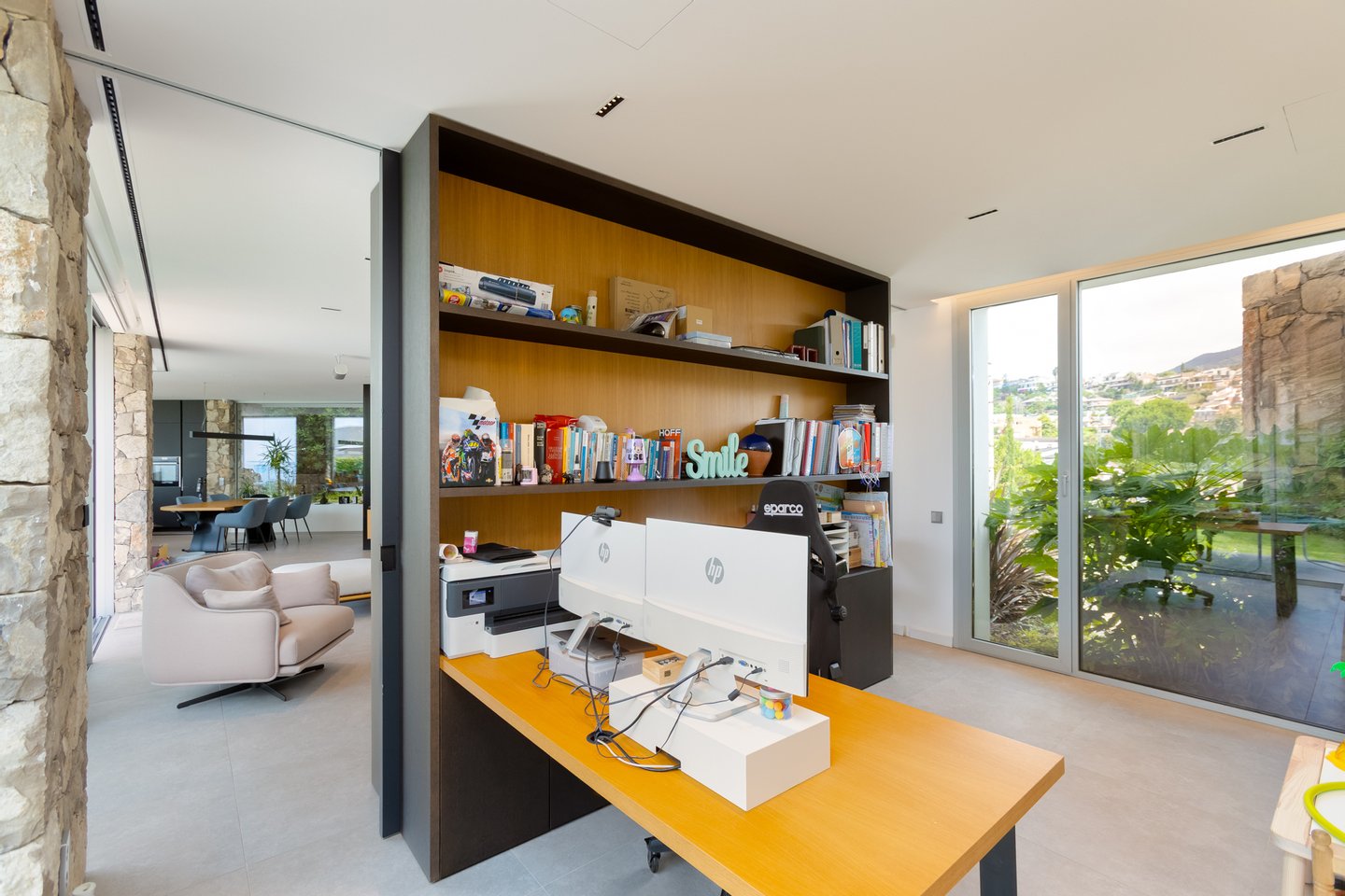 Hauptgeschoss: Ein großer, offener Raum, der Wohn- und Esszimmer mit Kamin, einem Bürobereich und einer großen Küche nach draußen integriert, ausgestattet mit hochwertigen Geräten. Große Fenster fluten die Räume mit natürlichem Licht und öffnen sich zum Garten mit atemberaubendem Meeresblick. Der Grillbereich dient als Sommeressensraum sowie als praktisches Außenbad.