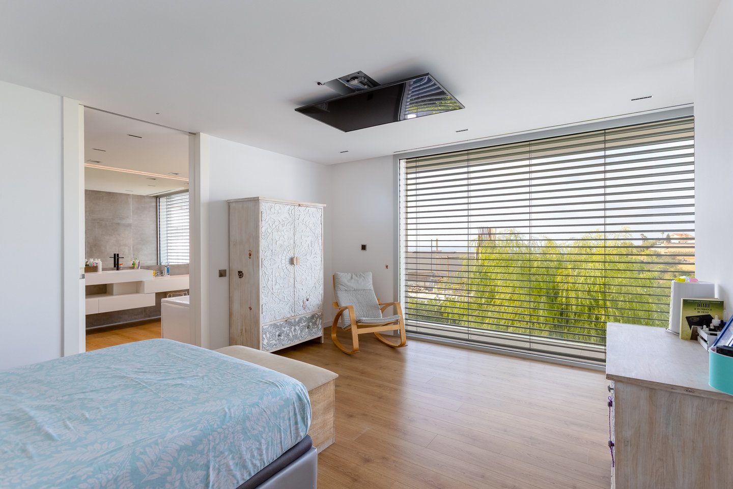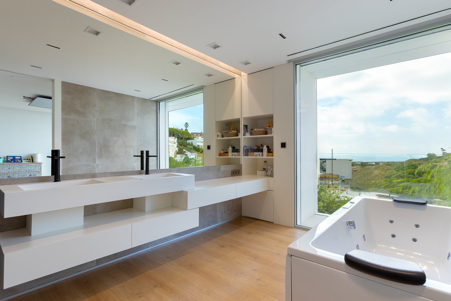 Erdgeschoss (Nachtbereich): Es gibt vier Schlafzimmer und zwei Badezimmer. Die Meistersuite mit mehr als 50 m² Fläche sticht hervor, mit einem spektakulären Umkleideraum und einem luxuriösen Badezimmer mit Whirlpool-Badewanne (1900x900 cm) und Meerblick. Die anderen drei Schlafzimmer – zwei Doppelzimmer und ein Einzelzimmer – teilen sich ein komplettes Badezimmer. Der Waschbereich befindet sich ebenfalls auf dieser Etage.