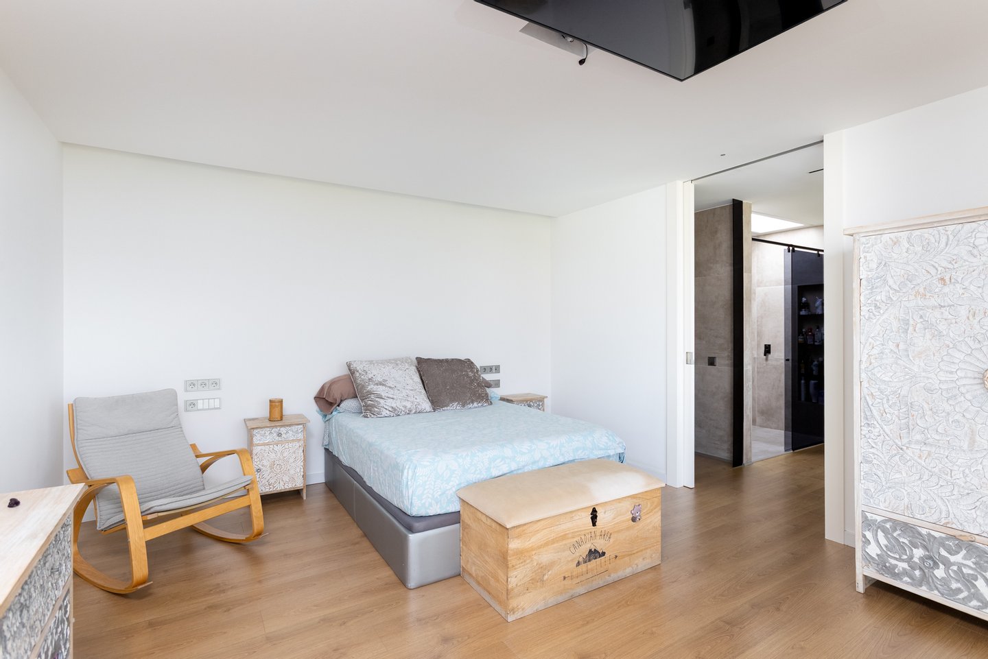 Erdgeschoss (Nachtbereich): Es gibt vier Schlafzimmer und zwei Badezimmer. Die Meistersuite mit mehr als 50 m² Fläche sticht hervor, mit einem spektakulären Umkleideraum und einem luxuriösen Badezimmer mit Whirlpool-Badewanne (1900x900 cm) und Meerblick. Die anderen drei Schlafzimmer – zwei Doppelzimmer und ein Einzelzimmer – teilen sich ein komplettes Badezimmer. Der Waschbereich befindet sich ebenfalls auf dieser Etage.