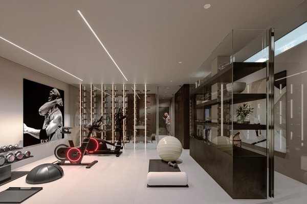 Wellness und Unterhaltung: Räume mit Kino, Fitnessstudio mit Umkleideräumen, Sauna und Weinkeller mit Verkostungsbereich.