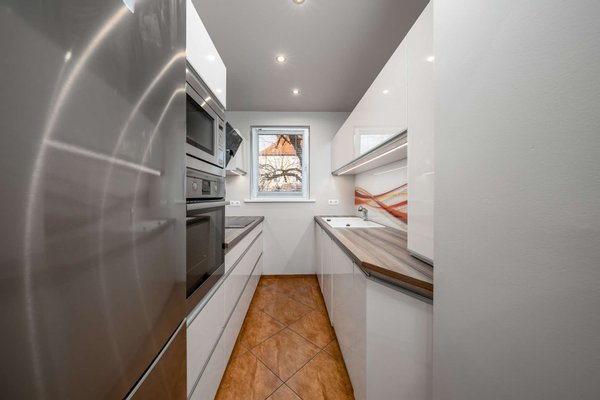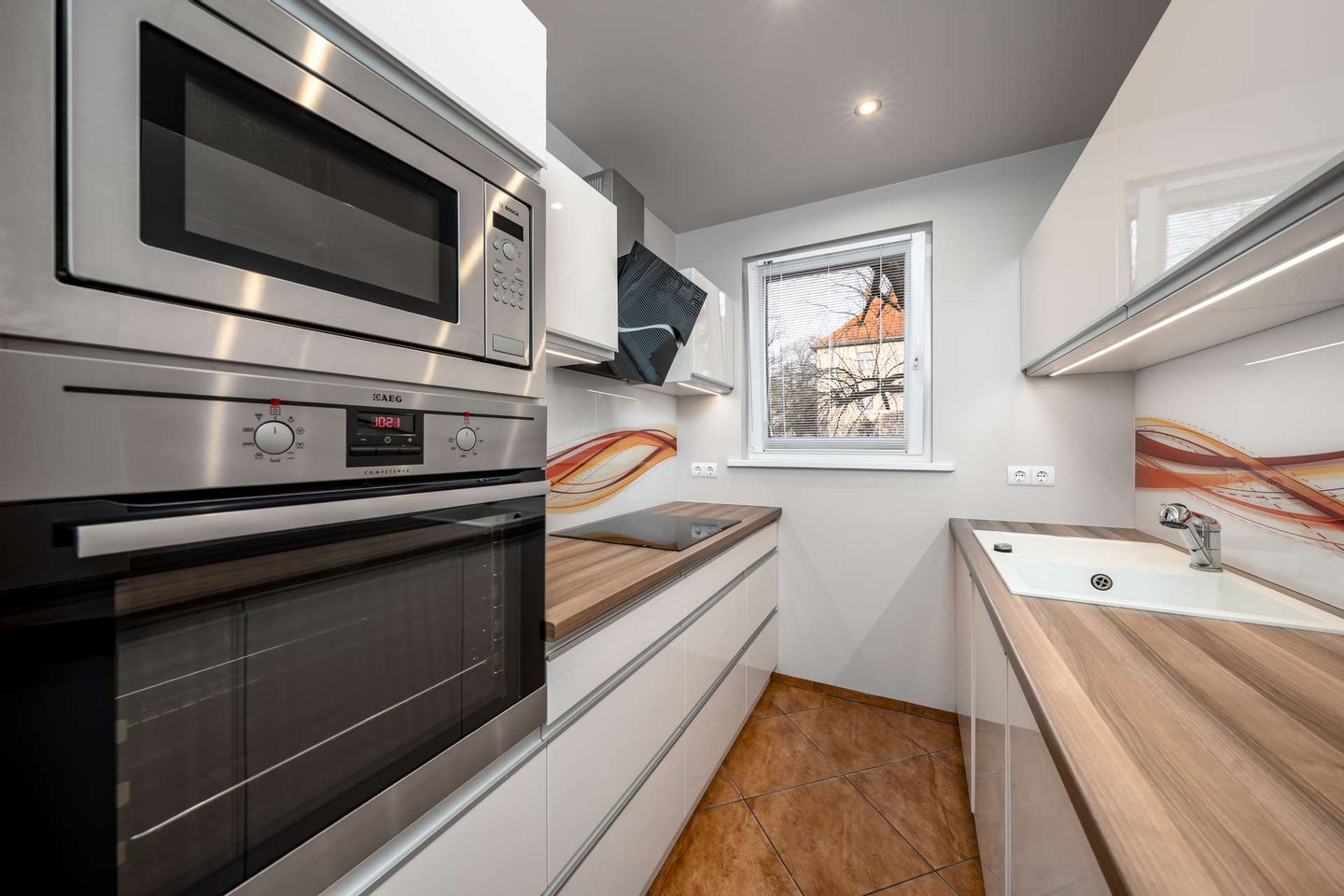 Das Wohnzimmer öffnet sich zu einem sonnigen Südbalkon mit schönem Grünblick – ein idealer Ort zum Entspannen. Die Küche ist vollständig ausgestattet und bietet mit Mikrowelle, Herd, Induktionskochfeld, Geschirrspüler, Kühl-Gefrierkombination sowie zahlreichen Ober- und Unterschränken eine funktionale und moderne Ausstattung.