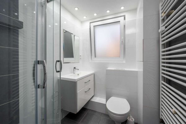 Das tagesbelichtete Bad ist hell gefliest und verfügt über ein Waschbecken, ein wandhängendes WC und eine Duschkabine. Beheizt wird die Wohnung über eine zentrale Heizungsanlage.