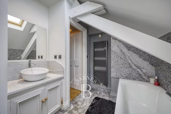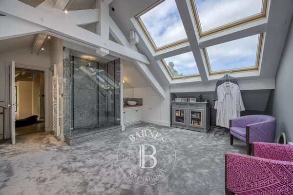 On the upper floor, a landing with storage space leads to two suites, each with its own bathroom or shower room and sloping-ceiling dressing areas, as well as a third bedroom and an independent bathroom with toilet.