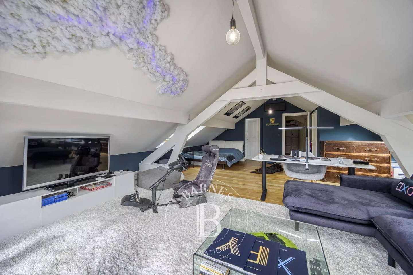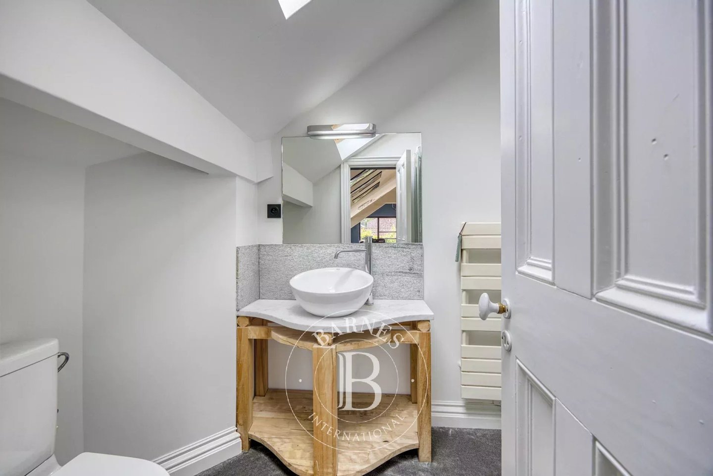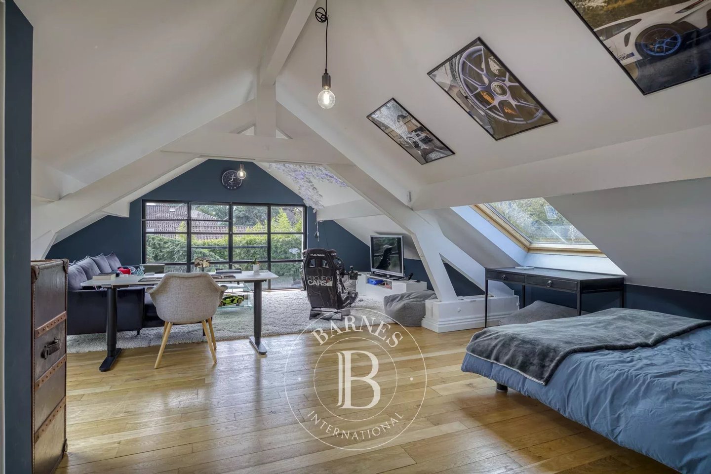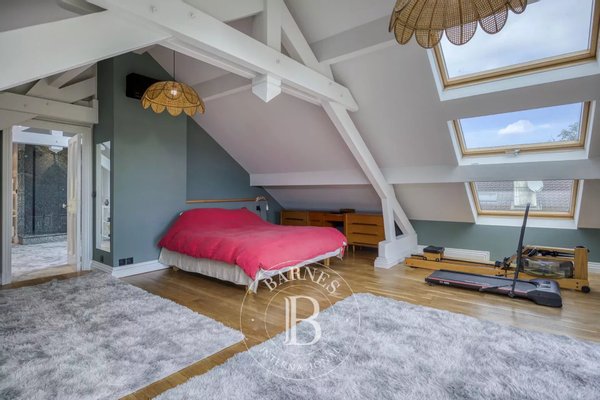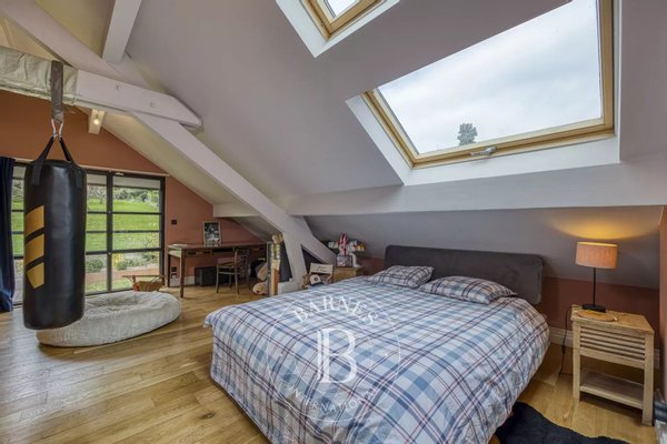On the upper floor, a landing with storage space leads to two suites, each with its own bathroom or shower room and sloping-ceiling dressing areas, as well as a third bedroom and an independent bathroom with toilet.