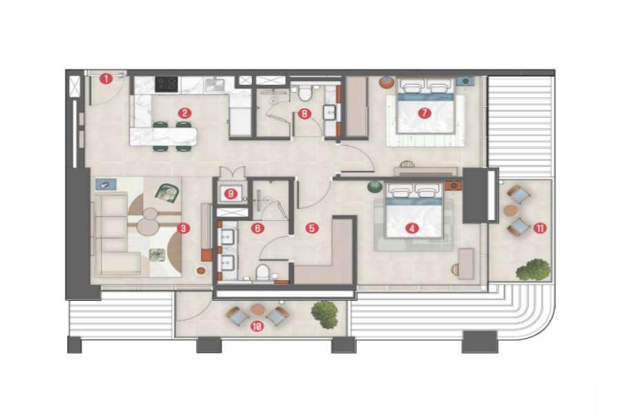 Sie brauchen einen Platz zum Arbeiten oder für eine Besprechung? Hierfür stehen den Bewohnern Co-Working-Spaces, Besprechungsräume und Arbeitspods zur Verfügung. Der 24/7-Sicherheitsdienst, die Rezeption und der Concierge-Service sorgen für Ruhe, während die Smart-Home-Technologie einen Hauch von Modernität in Ihr Wohngefühl bringt. Hausmeister-, Wäsche- und Wartungsdienste sind ebenfalls auf Anfrage verfügbar und machen das Leben zu einem Kinderspiel.